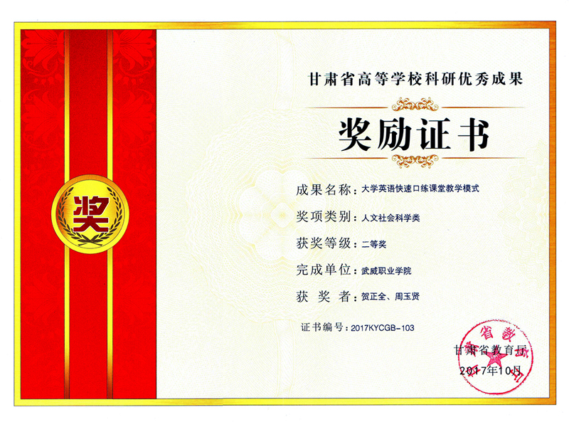 近日從學(xué)院科研處傳來喜訊,我系教師賀正全申報(bào)的《大學(xué)英語快速口練課堂教學(xué)模式》榮獲甘肅省教育廳頒發(fā)的2017年甘肅省高等學(xué)校科研優(yōu)秀成果二等獎(jiǎng)。這是我院自建院以來獲得的最高級(jí)別的高??蒲袃?yōu)秀成果獎(jiǎng)。本次獲得二等獎(jiǎng)的科研成果共有154項(xiàng),其中高職高專報(bào)送的科研成果只有9項(xiàng)獲得二等獎(jiǎng)。
