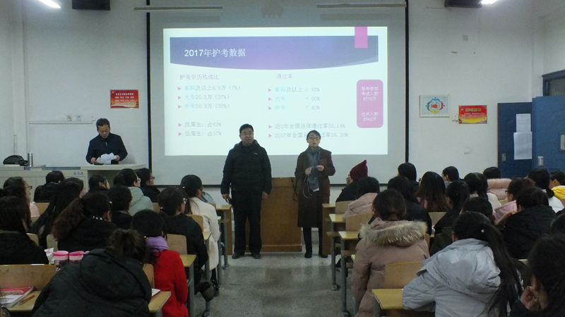 為了進(jìn)一步提高我系學(xué)生的專業(yè)水平和護(hù)考過關(guān)率,讓2018屆畢業(yè)生更好地應(yīng)對護(hù)士資格考試,12月20日晚,護(hù)理系在明遠(yuǎn)樓211教室舉辦了以護(hù)考為主題的講座,15級(jí)護(hù)理、助產(chǎn)專業(yè)共100余人聆聽了此次講座。護(hù)理系黨總支書記張建輝、系主任韓曉萍參加講座并講話。
