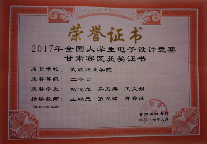 近日,2017年全國(guó)大學(xué)生電子設(shè)計(jì)競(jìng)賽甘肅賽區(qū)成績(jī)揭曉。由電子信息工程系2016級(jí)應(yīng)用電子技術(shù)專業(yè)楊飛龍、馬玉萍、王文娟3名同學(xué)組成的團(tuán)隊(duì)在我系王鵬元、張兆津、郭睿涵3名教師指導(dǎo)下榮獲甘肅賽區(qū)二等獎(jiǎng)。此次獲獎(jiǎng)也是我系在優(yōu)質(zhì)校建設(shè)中狠抓教學(xué)科研和學(xué)生技能培養(yǎng)方面取得的豐碩成果。