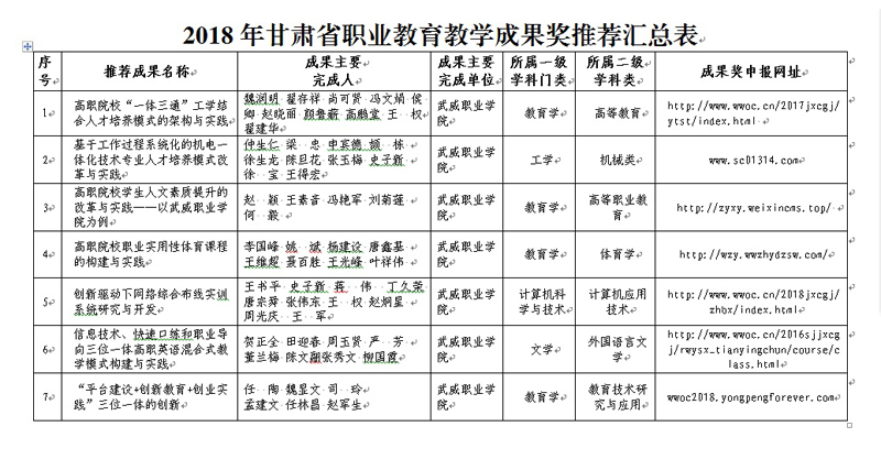 根據(jù)甘肅省人力資源和社會(huì)保障廳、甘肅省教育廳《關(guān)于開展2018年甘肅省職業(yè)教育教學(xué)成果獎(jiǎng)評(píng)選表彰工作的通知》精神,經(jīng)個(gè)人申報(bào),學(xué)院審核,決定擬推薦以下所提交紙質(zhì)材料、電子材料、申報(bào)網(wǎng)站等符合申報(bào)要求的12項(xiàng)教學(xué)成果參評(píng)2018年甘肅省職業(yè)教育教學(xué)成果獎(jiǎng),現(xiàn)予以公示。
