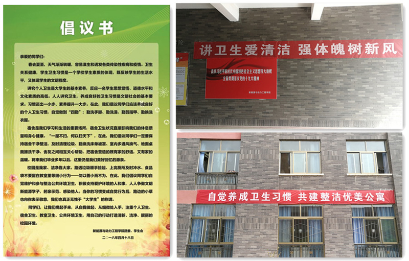 學院面向全體同學發(fā)出倡議,并在教學樓、公寓樓粘貼了倡議書,倡議全體同學養(yǎng)成良好的個人衛(wèi)生習慣,自覺做到“四勤”:勤洗手腳、勤洗澡、勤剪指甲、勤換洗衣服;保持宿舍干凈整潔,及時清理垃圾、勤換洗床單被罩、室內多通風換氣、地面桌面擦洗干凈、舍友之間相互關心幫助,把宿舍營造得既有家的舒適,又有家的溫暖;自覺維護和參與整治公共環(huán)境衛(wèi)生,從路遇垃圾順手撿起、上完廁所及時沖水、食品袋不要留在教室里等細小行為入手,躬親示范、感染他人,用自己的行動打造清新、潔凈、靚麗的校園環(huán)境,無愧于“大學生”的稱謂。學院還在教學樓和公寓樓分別懸掛了“講衛(wèi)生愛清潔強體魄樹新風”、“自覺養(yǎng)成衛(wèi)生習慣 共建整潔優(yōu)美公寓”等內容的宣傳條幅。