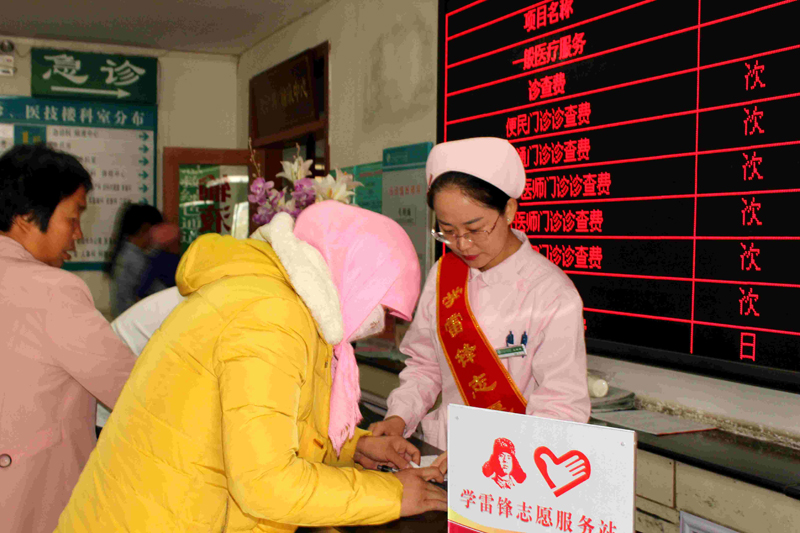 學(xué)雷鋒志愿服務(wù)站工作人員主要由年輕護(hù)士們擔(dān)任。她們身著護(hù)士裝,佩戴印有“學(xué)雷鋒志愿者服務(wù)”字樣綬帶,主動(dòng)為患者服務(wù)。志愿者們提供的主要服務(wù)項(xiàng)目有:在門診為老、弱、病、殘、孕等患者提供輪椅擔(dān)架租借。為患者提供開水、就醫(yī)導(dǎo)診、戒煙勸導(dǎo)、醫(yī)學(xué)人文關(guān)懷、慢性病知識(shí)普及和健康宣教等便民利民服務(wù),受到了患者及家屬的一致好評。