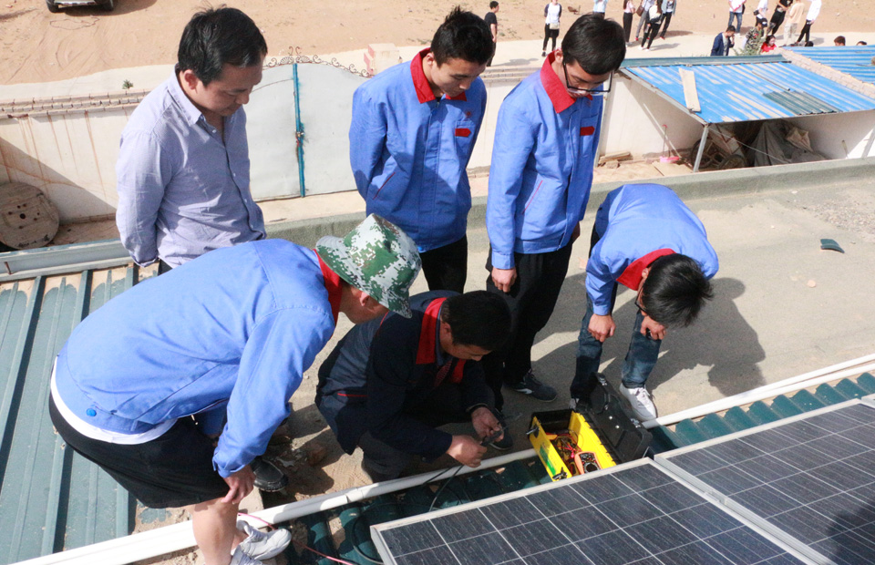 走進圓夢新村,由學院校辦企業(yè)武威泰豐新能源有限公司建設的200戶貧困家庭戶均3kw的分布式光伏發(fā)電系統映入眼簾。在社區(qū)書記郭林春的帶領下,黨員教師和學生入黨積極分子上門幫助用戶檢查維修光伏發(fā)電設備,檢查光伏組件的老化跡象以及所有連接器是否連接緊密、有無腐蝕現象,檢查組件是否接地良好。了解農戶的需求,為農戶講解光伏設備后期維護、電費結算方式以及國家扶貧惠民的政策等知識,并對部分農戶屋頂光伏組件故障進行了排除,對光伏組件進行了大面積清潔維護。