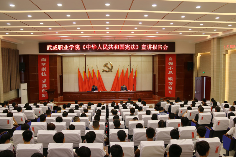 為深入推進《中華人民共和國憲法》和《中華人民共和國憲法(修正案)》學習宣傳,提高廣大師生“學習憲法、尊崇憲法”的自覺性,6月7日,武威職業(yè)學院組織開展專題宣講活動,邀請市檢察院檢委會專職委員郝建宏檢察官來學院作宣講報告。學院領導班子成員,副科級以上干部及師生代表共220余人參加了宣講報告會。報告會由黨委副書記趙明主持。