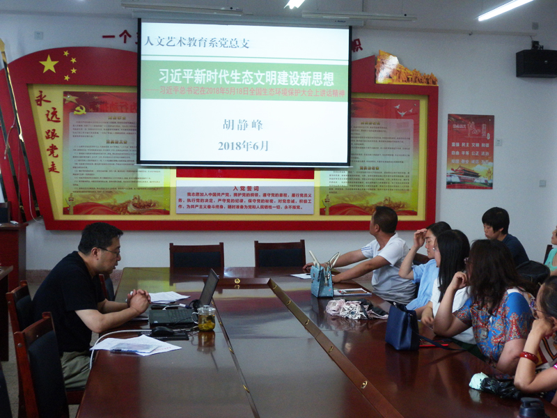 為深入學(xué)習(xí)習(xí)近平新時(shí)代中國特色社會(huì)主義思想,人文藝術(shù)教育系黨總支于6月13日下午在勵(lì)勤樓209黨員活動(dòng)室開展書記講黨課活動(dòng)。黨課由系黨總支書記胡靜峰主講,題目為《習(xí)近平新時(shí)代生態(tài)文明建設(shè)新思想》,系全體黨員參加了此次活動(dòng)。