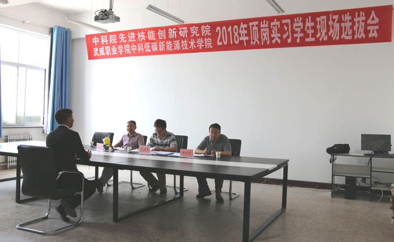 ? ? 2018年6月21日,中國(guó)科學(xué)院先進(jìn)核能創(chuàng)新研究院在學(xué)院舉行了2018年頂崗實(shí)習(xí)學(xué)生現(xiàn)場(chǎng)選撥會(huì),由中科院先進(jìn)核能創(chuàng)新研究院綜合管理部常務(wù)副主任王納秀、熔鹽機(jī)械部熱工組組長(zhǎng)王曉和中科武威新能源研究所所長(zhǎng)朱智勇組成的專家組對(duì)能源類專業(yè)和機(jī)械類專業(yè)學(xué)生進(jìn)行了現(xiàn)場(chǎng)面試,遴選出的14名同學(xué)將于7月份前往中國(guó)科學(xué)院先進(jìn)核能創(chuàng)新研究院進(jìn)行為期一年的專業(yè)頂崗實(shí)習(xí),他們將在中科院先進(jìn)核能創(chuàng)新研究院專家教授的帶領(lǐng)下,通過(guò)一對(duì)一指導(dǎo)和崗位輪訓(xùn)等形式全面系統(tǒng)完成頂崗實(shí)習(xí),了解行業(yè)技術(shù)需求和技術(shù)最新進(jìn)展,掌握更多的專業(yè)知識(shí)和實(shí)踐技能,感受頂級(jí)科研院所深厚的科技氛圍和文化氛圍,全面提升專業(yè)水平和綜合素養(yǎng),為成功走向社會(huì)奠定良好的基礎(chǔ)。