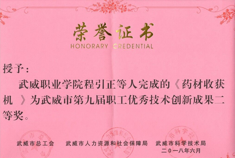 近日,武威市總工會(huì)、武威市人力資源和社會(huì)保障局、武威市科學(xué)技術(shù)局在全市企事業(yè)單位和廣大職工中廣泛開(kāi)展了征集評(píng)選職工優(yōu)秀技術(shù)創(chuàng)新成果活動(dòng)。經(jīng)過(guò)逐級(jí)推薦、專(zhuān)家評(píng)審、網(wǎng)絡(luò)公示等程序,我系教師程引正等完成的《藥材收獲機(jī)》喜獲武威市第九屆職工優(yōu)秀技術(shù)創(chuàng)新成果二等獎(jiǎng)。