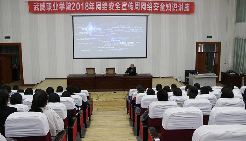 為深入學(xué)習(xí)宣傳貫徹習(xí)近平總書(shū)記在全國(guó)網(wǎng)絡(luò)安全和信息化工作會(huì)議上“深入開(kāi)展網(wǎng)絡(luò)安全知識(shí)技能宣傳普及,提高廣大人民群眾網(wǎng)絡(luò)安全意識(shí)和防護(hù)技能”的重要講話精神,按照甘肅省教育廳、武威市網(wǎng)信辦關(guān)于開(kāi)展2018年國(guó)家網(wǎng)絡(luò)安全宣傳周活動(dòng)的要求。9月18日下午,學(xué)院在正德廳舉辦了“網(wǎng)絡(luò)安全與《網(wǎng)絡(luò)安全法》”的專題講座,師生代表200余人參加。
