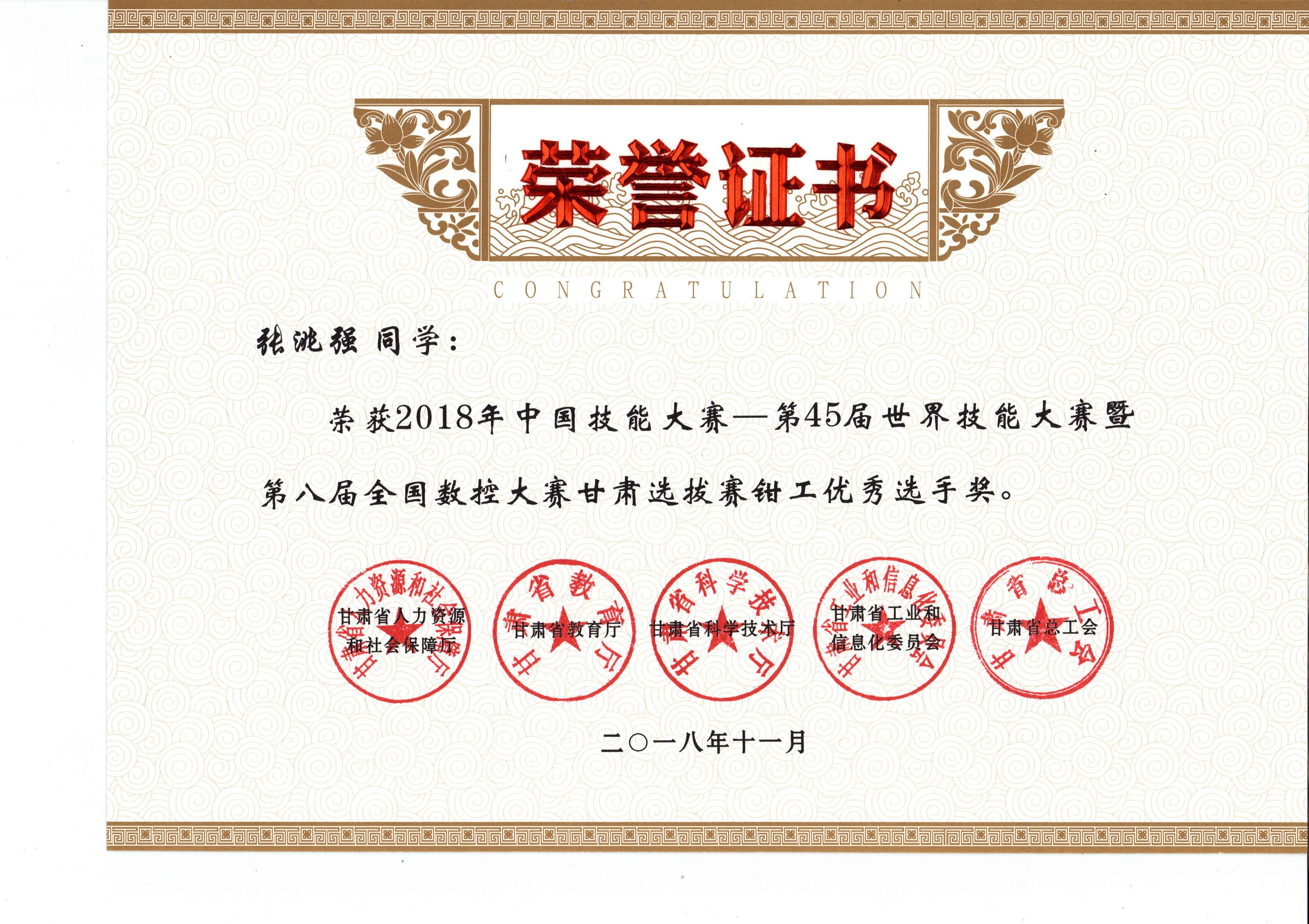 2018年中國技能大賽--第45屆世界技能大賽暨第八屆全國數(shù)控大賽甘肅選拔賽(鉗工項(xiàng)目)獲獎(jiǎng)證書