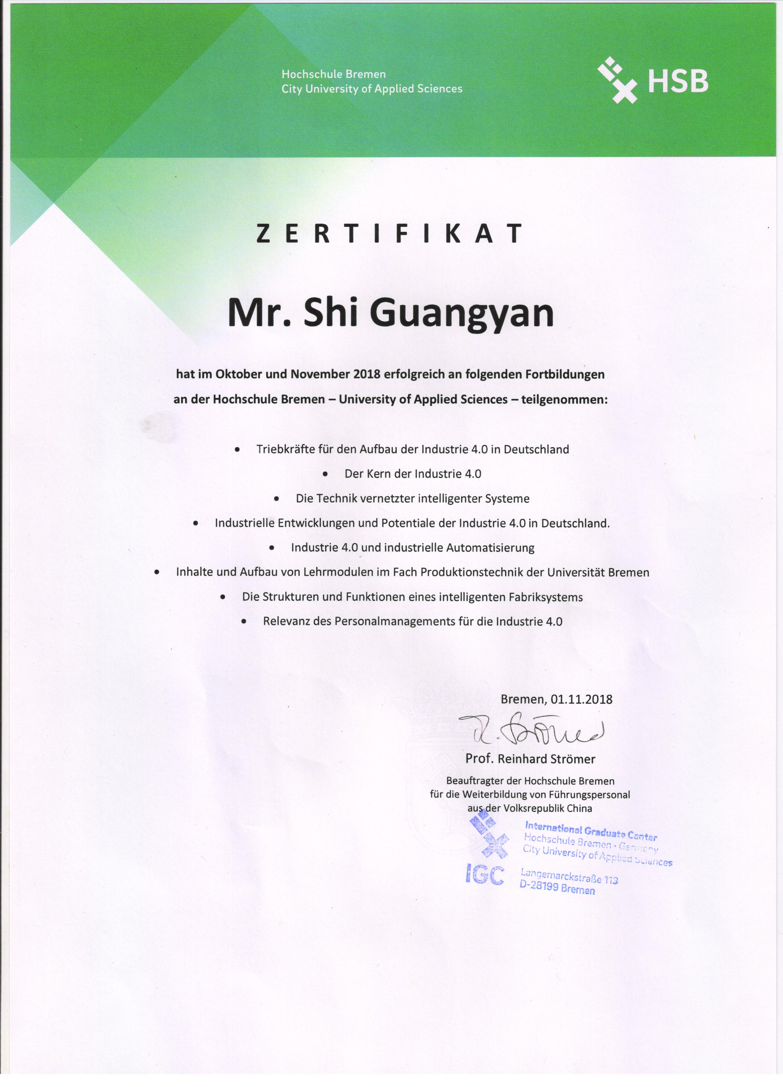 ?史光巖老師參加由甘肅省外專局組織的2018年出國(境)培訓(xùn)項(xiàng)目計(jì)劃,前往德國不萊梅應(yīng)用科技大學(xué)參加為期14天的“工業(yè)4.0工廠實(shí)驗(yàn)室建設(shè)培訓(xùn)團(tuán)”。