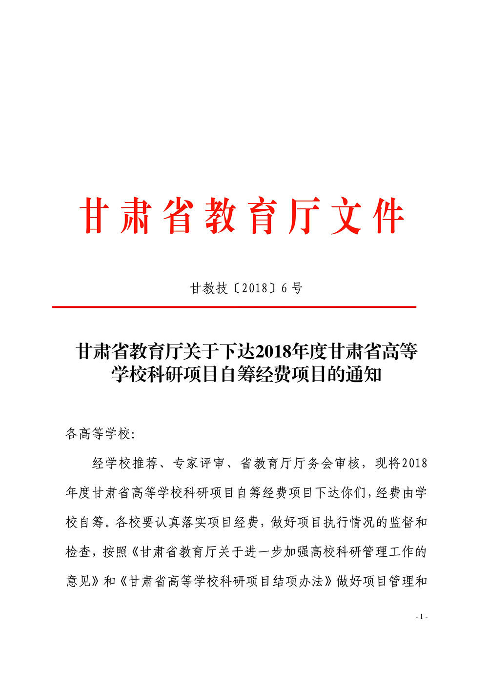 甘肅省教育廳關(guān)于下達(dá)2018年度甘肅省高等學(xué)??蒲许?xiàng)目自籌經(jīng)費(fèi)項(xiàng)目的通知
