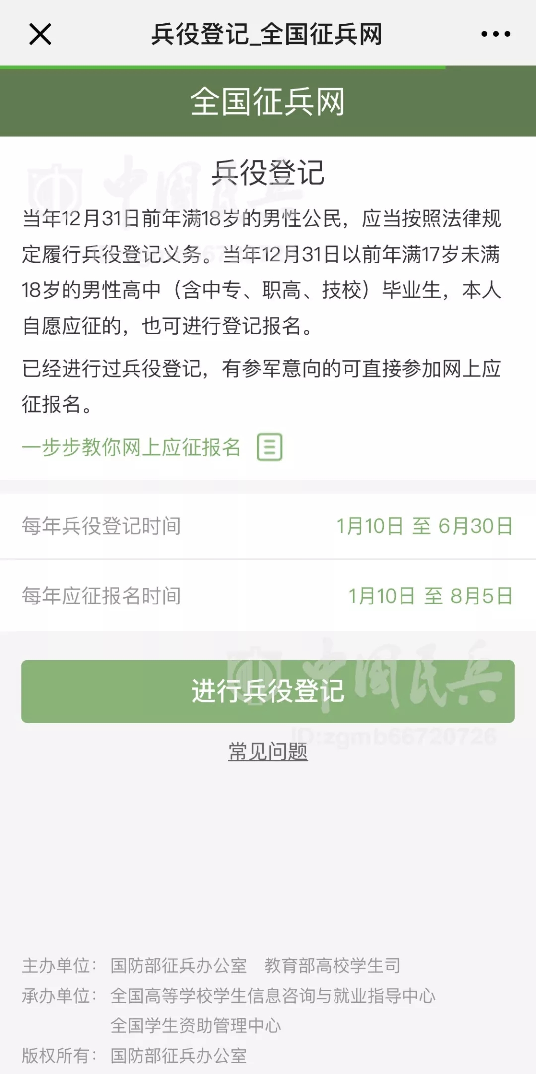 中國民兵北京1月9日電?張東華、記者劉國順報(bào)道:日前,國防部征兵辦公室下發(fā)《關(guān)于做好2019年征兵準(zhǔn)備工作的通知》,對新年度征兵準(zhǔn)備工作進(jìn)行安排部署,要求各地深入貫徹習(xí)近平強(qiáng)軍思想,全面聚焦備戰(zhàn)打仗,統(tǒng)籌推進(jìn)征兵組織建設(shè)、能力建設(shè)、法規(guī)建設(shè)、廉政建設(shè),確保高質(zhì)量完成新年度征兵任務(wù),并明確全國征兵網(wǎng)(網(wǎng)址:http://www.gfbzb.gov.cn),或關(guān)注“中國民兵”微信公眾號(ID:zgmb66720726)1月10日正式開通,受理網(wǎng)上兵役登記、應(yīng)征報(bào)名和政策咨詢等工作事項(xiàng)。