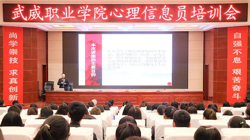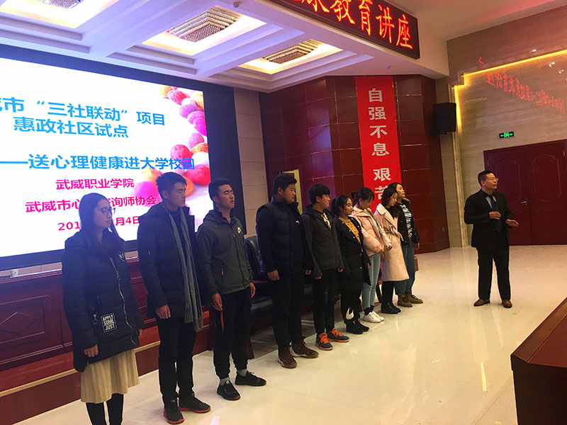 12月4日晚上,學生工作處聯(lián)合武威市“三社聯(lián)動”惠政社區(qū)試點項目在學院菁英廳舉辦了心理健康專題講座暨心理信息員培訓。此次講座邀請武威市心理咨詢師協(xié)會會長何飛老師主講,學院各系輔導員、2017級、2018級班級心理信息員、心翼心理社團會員等220多人聆聽了講座。學生工作處處長王守云主持活動。