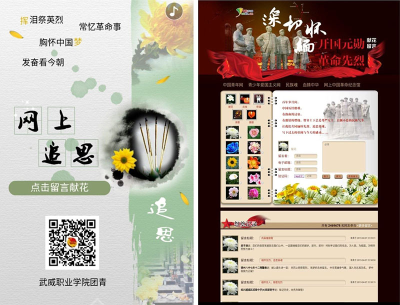 院團(tuán)委在“武威職業(yè)學(xué)院團(tuán)青”微信公眾平臺(tái)開(kāi)設(shè)清明網(wǎng)上祭英烈專(zhuān)欄,共有3968名同學(xué)參與了線上活動(dòng)。同學(xué)們帶著誠(chéng)摯的敬意向烈士們鞠躬、獻(xiàn)花,并在留言區(qū)發(fā)表祭掃寄語(yǔ),以此緬懷先烈的豐功偉績(jī),追憶烈士之德。