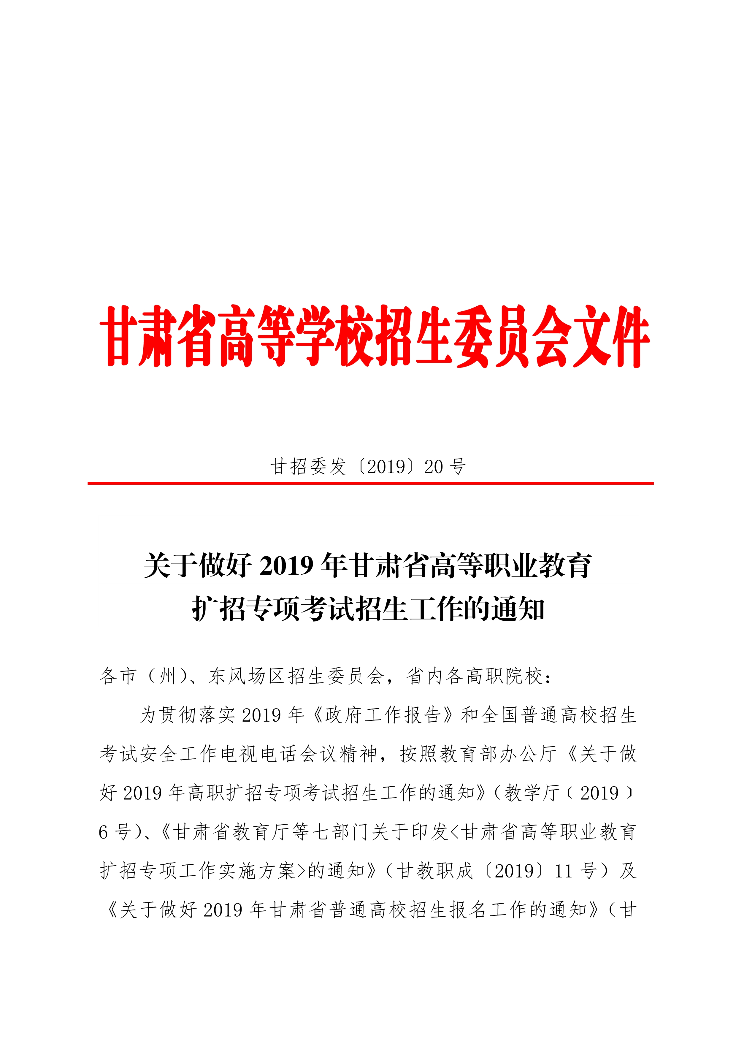 19年關(guān)于做好2019年甘肅省高等職業(yè)教育擴(kuò)招專項(xiàng)考試招生工作的通知