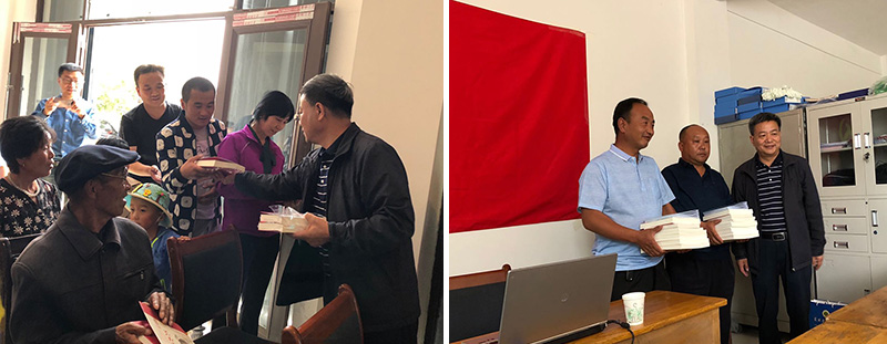 課后,學(xué)院領(lǐng)導(dǎo)把《習(xí)近平新時(shí)代中國(guó)特色社會(huì)主義思想學(xué)習(xí)綱要》《習(xí)近平新時(shí)代中國(guó)特色社會(huì)主義思想三十講》《全國(guó)優(yōu)秀共產(chǎn)黨員風(fēng)采錄》《新時(shí)代黨支部規(guī)范化建設(shè)工作實(shí)用手冊(cè)》和“掃黑除惡”知識(shí)手冊(cè)等14類(lèi)50多冊(cè)黨建書(shū)籍分別贈(zèng)送給蘆草溝村、尚家臺(tái)村黨支部和駐村工作隊(duì),還向聽(tīng)課的村民黨員贈(zèng)送《習(xí)近平的七年知青歲月》等書(shū)籍。進(jìn)村入戶(hù)的幫扶干部向幫扶戶(hù)村民黨員贈(zèng)送了黨建書(shū)籍。共贈(zèng)送100多冊(cè)價(jià)值2700多元黨建書(shū)籍和掃黑除惡手冊(cè)。