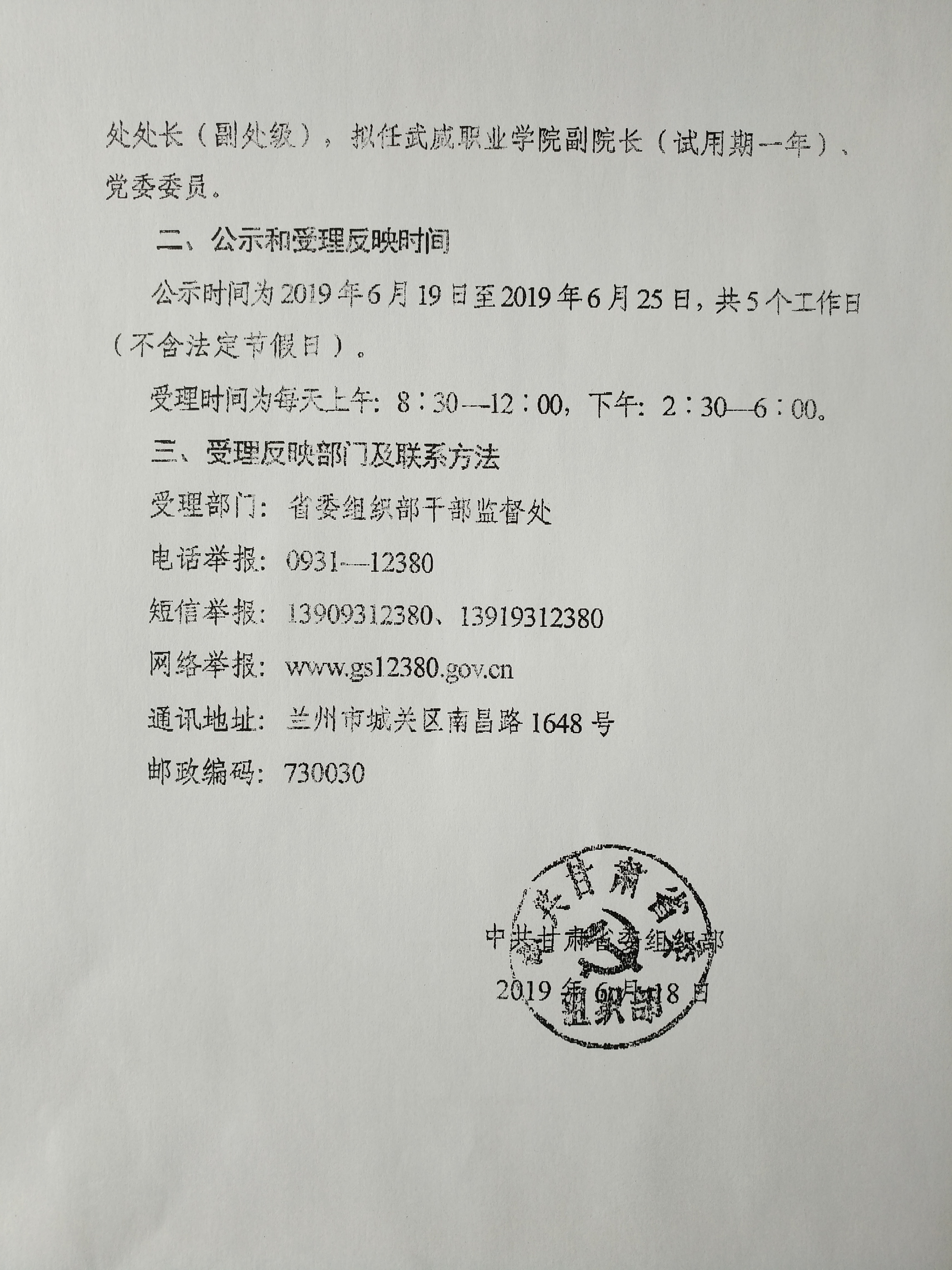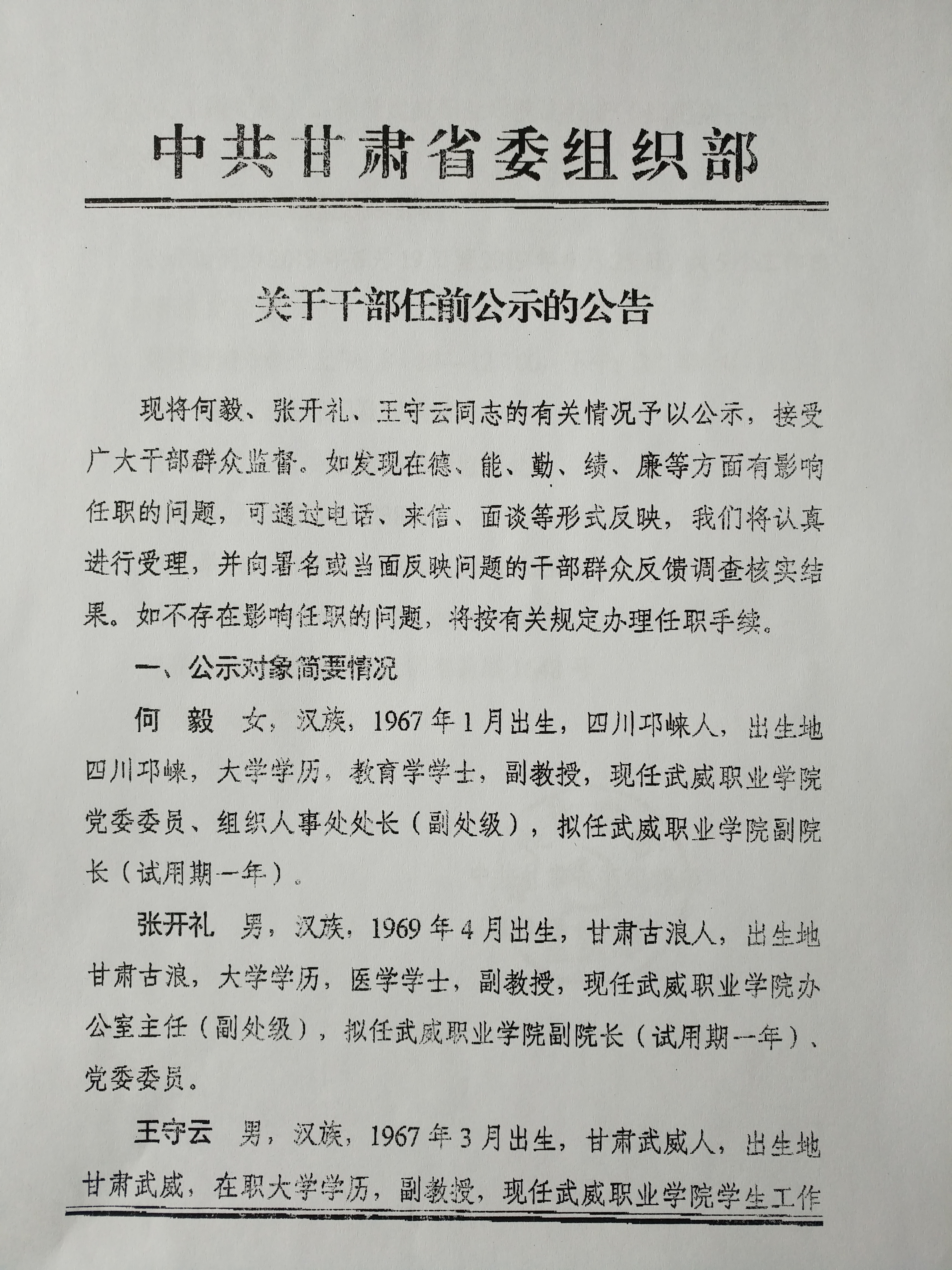 現(xiàn)將省委組織部關于何毅、張開禮、王守云同志的有關情況予以公示,接受廣大干部群眾監(jiān)督。