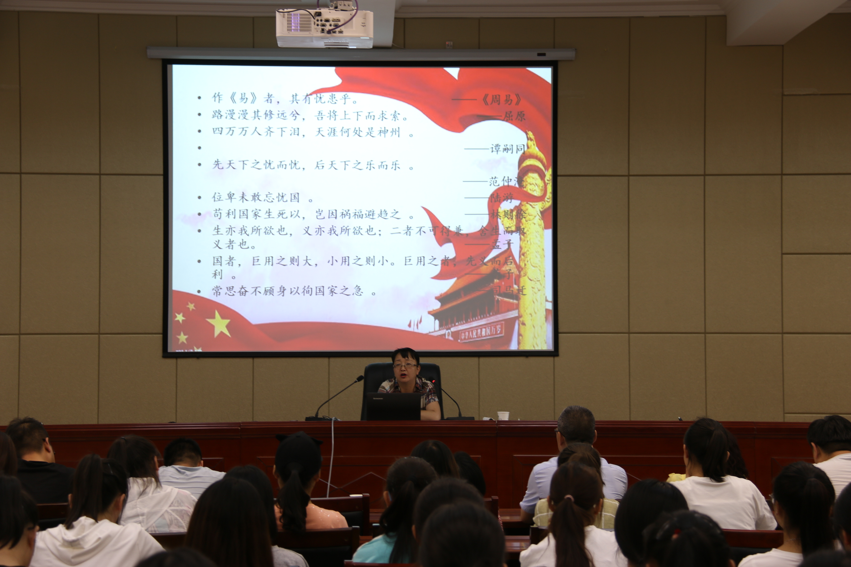 田迎春分別從溯源、求理、踐行三個(gè)方面深刻講解了愛國(guó)主義精神的傳承與弘揚(yáng)。一是探尋中華民族愛國(guó)主義精神的基因,歷史深刻表明,愛國(guó)主義自古以來就流淌在中華民族血脈之中,去不掉,打不破,滅不了;二是洞悉當(dāng)代中國(guó)愛國(guó)主義的思想真諦,指出對(duì)新時(shí)代中國(guó)青年來說,熱愛祖國(guó)是立身之本、成才之基。三是讓愛國(guó)主義精神代代相傳、發(fā)揚(yáng)光大,要求新時(shí)代師生要聽黨話、跟黨走,胸懷憂國(guó)憂民之心、愛國(guó)愛民之情,懂得奉獻(xiàn)祖國(guó)、奉獻(xiàn)人民,以一生的真情投入、一輩子的頑強(qiáng)奮斗來體現(xiàn)愛國(guó)主義情懷,讓愛國(guó)主義的偉大旗幟始終在心中高高飄揚(yáng)!