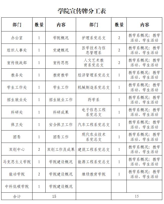 見(jiàn)“學(xué)院宣傳牌分工表”。數(shù)量不夠或者表中未涉及到的部門(mén)、單位,如果需要可另行向宣傳統(tǒng)戰(zhàn)部提出申請(qǐng)。