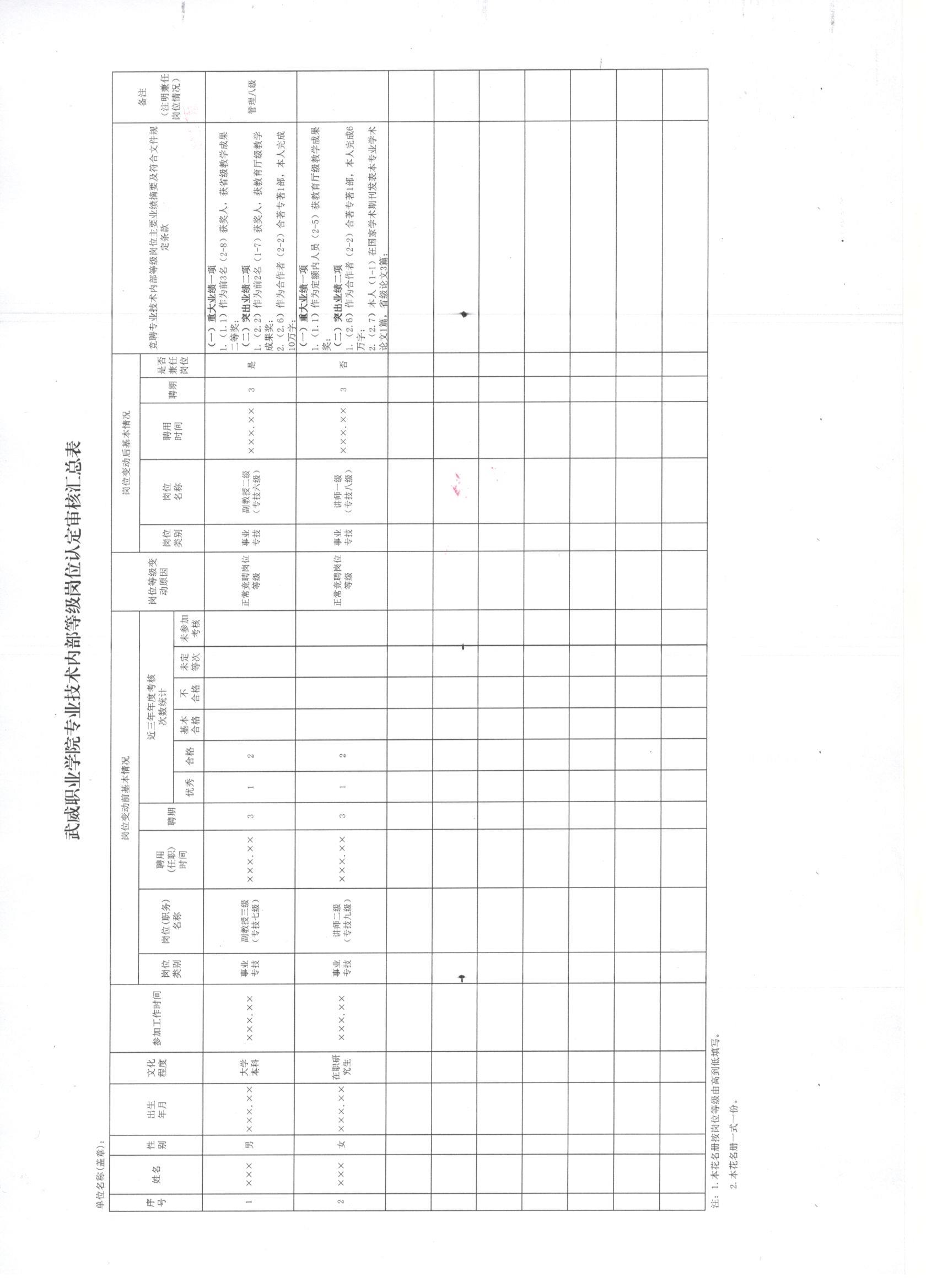 武威職業(yè)學院專業(yè)技術內(nèi)部等級崗位認定審核匯總表2019 - 樣表