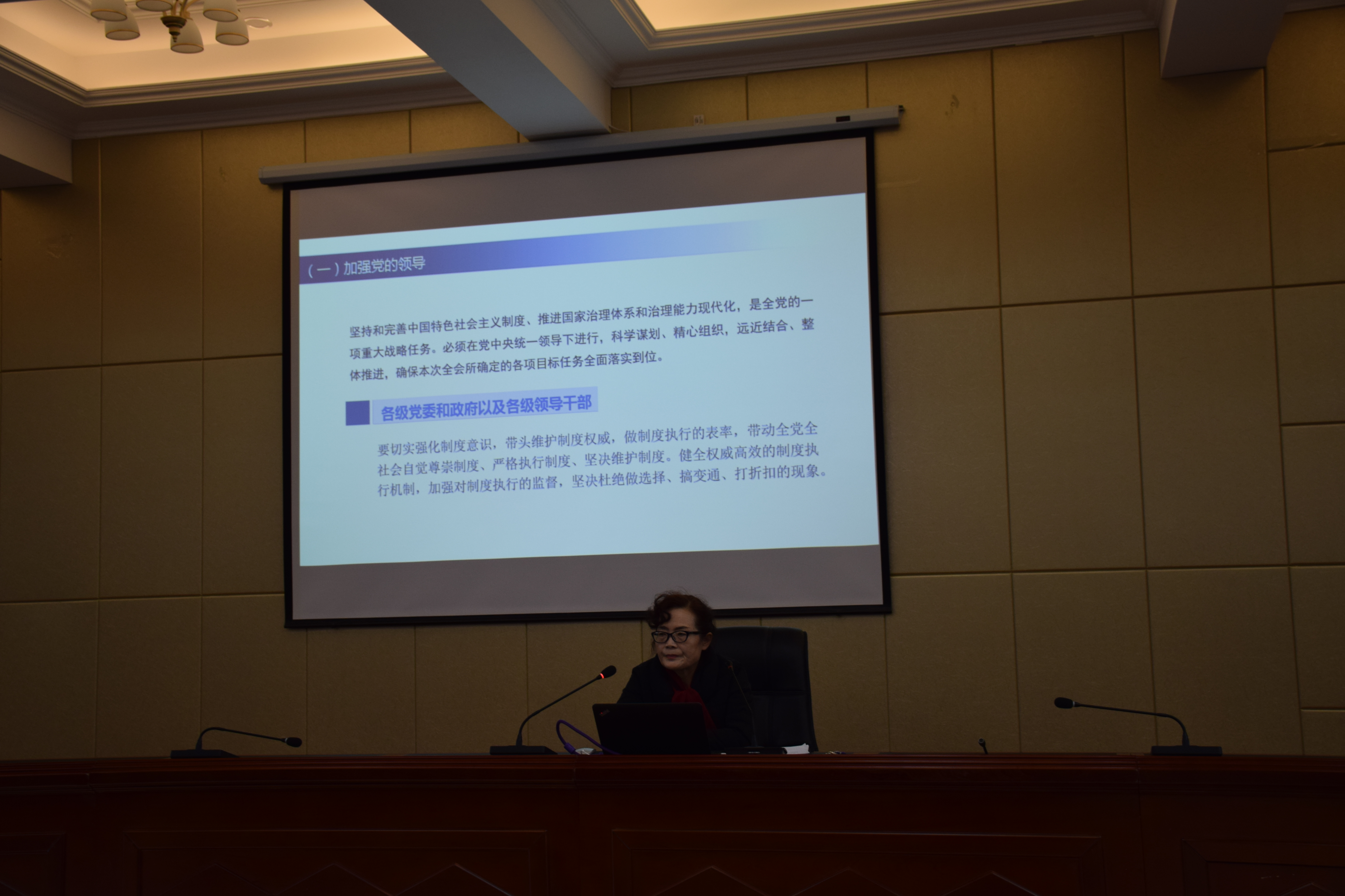 晏素珍以《中共中央關(guān)于堅持和完善中國特色社會主義制度推進(jìn)國家治理體系和治理能力現(xiàn)代化若干重大問題的決定》的學(xué)習(xí)與解讀為題,重點就全會召開的背景、意義和看點;《決定》的基本框架和主要內(nèi)容以及抓好全會的學(xué)習(xí)貫徹的具體要求進(jìn)行了宣講。要求廣大師生提高政治站位,樹牢“四個意識”,堅定“四個自信”,做到“兩個維護(hù)”,推動全會精神在全系落地生根、取得扎實成效。為實現(xiàn)“兩個一百年”奮斗目標(biāo),實現(xiàn)中華民族偉大復(fù)興的中國夢而努力奮斗。