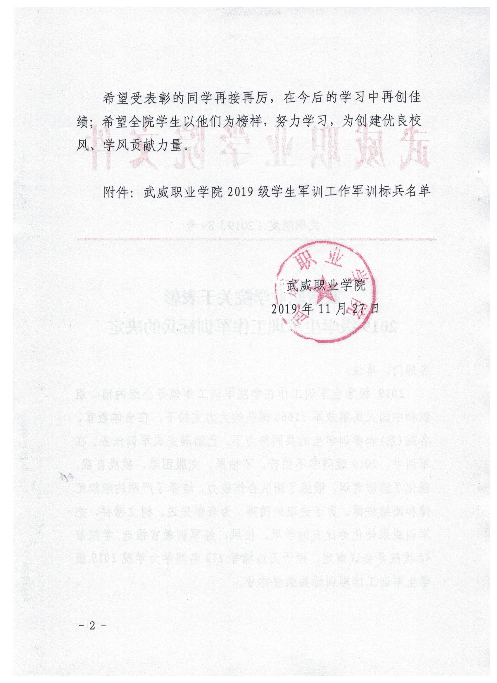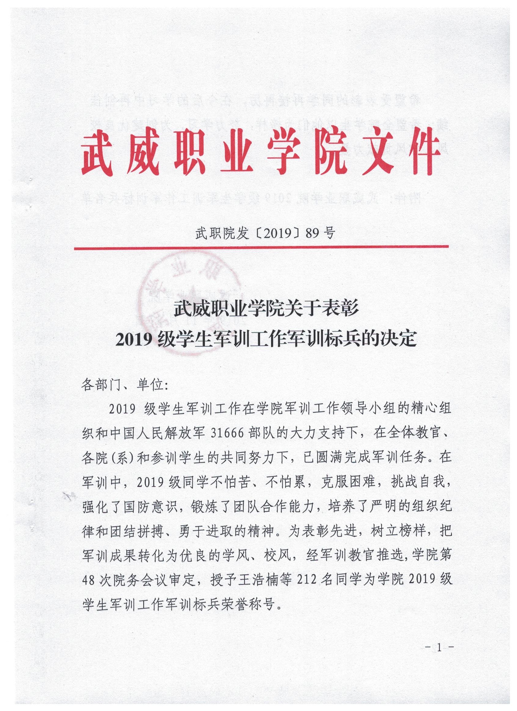 武威職業(yè)學(xué)院關(guān)于表彰2019級(jí)學(xué)生軍訓(xùn)工作先進(jìn)集體、先進(jìn)個(gè)人的決定