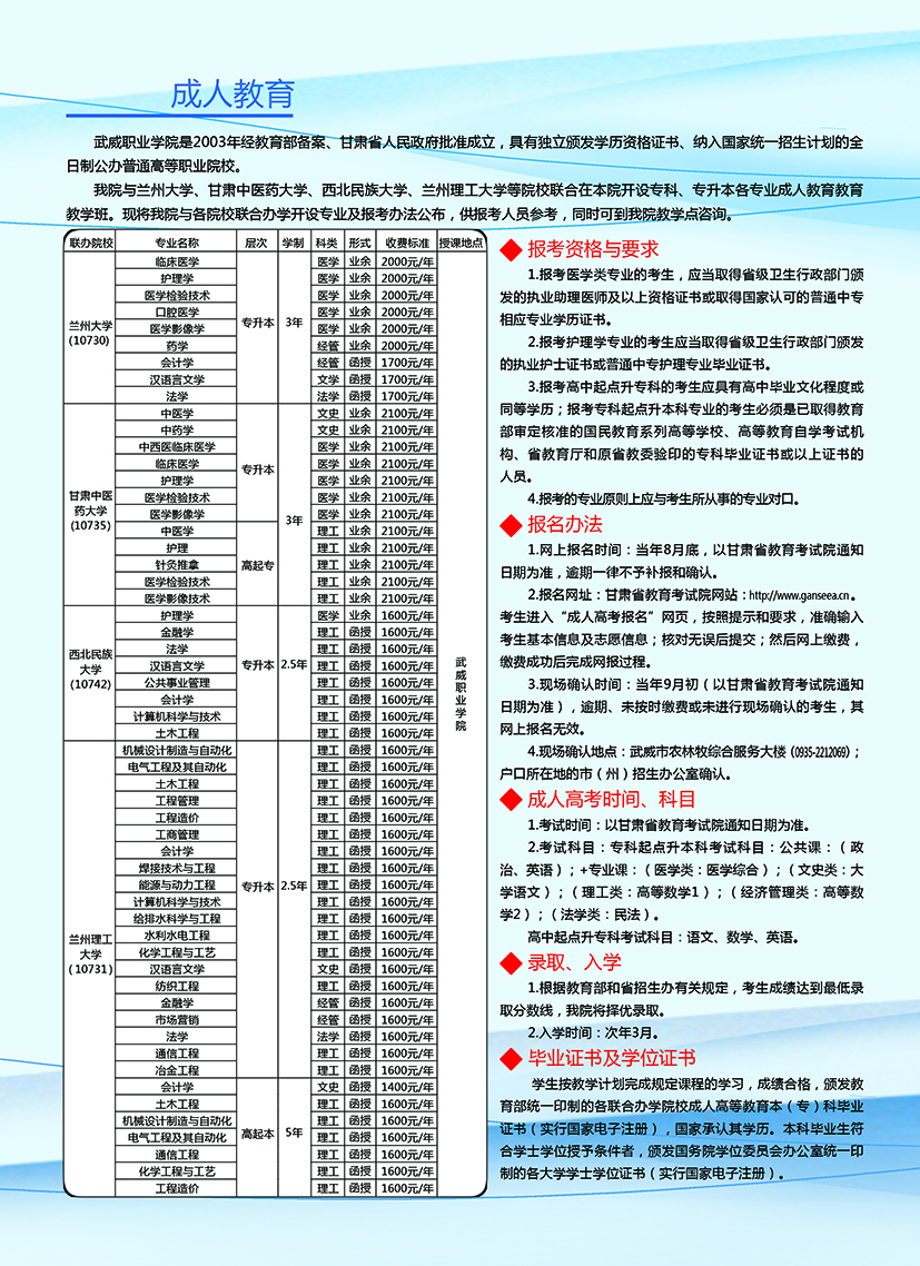 武威職業(yè)學(xué)院繼續(xù)教育學(xué)院2020年招生簡章