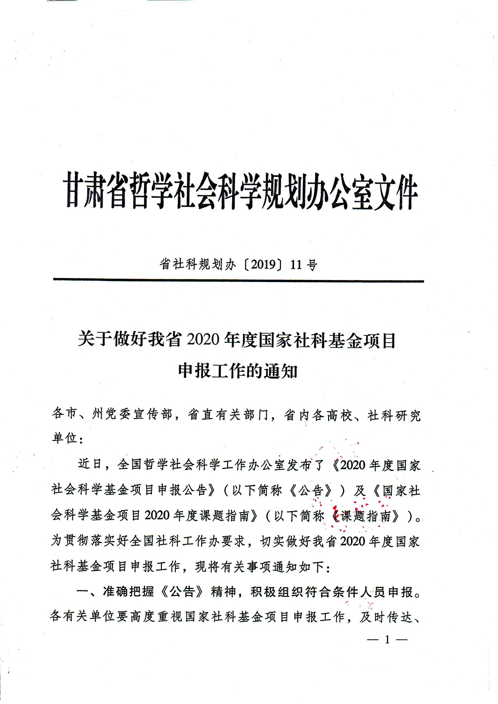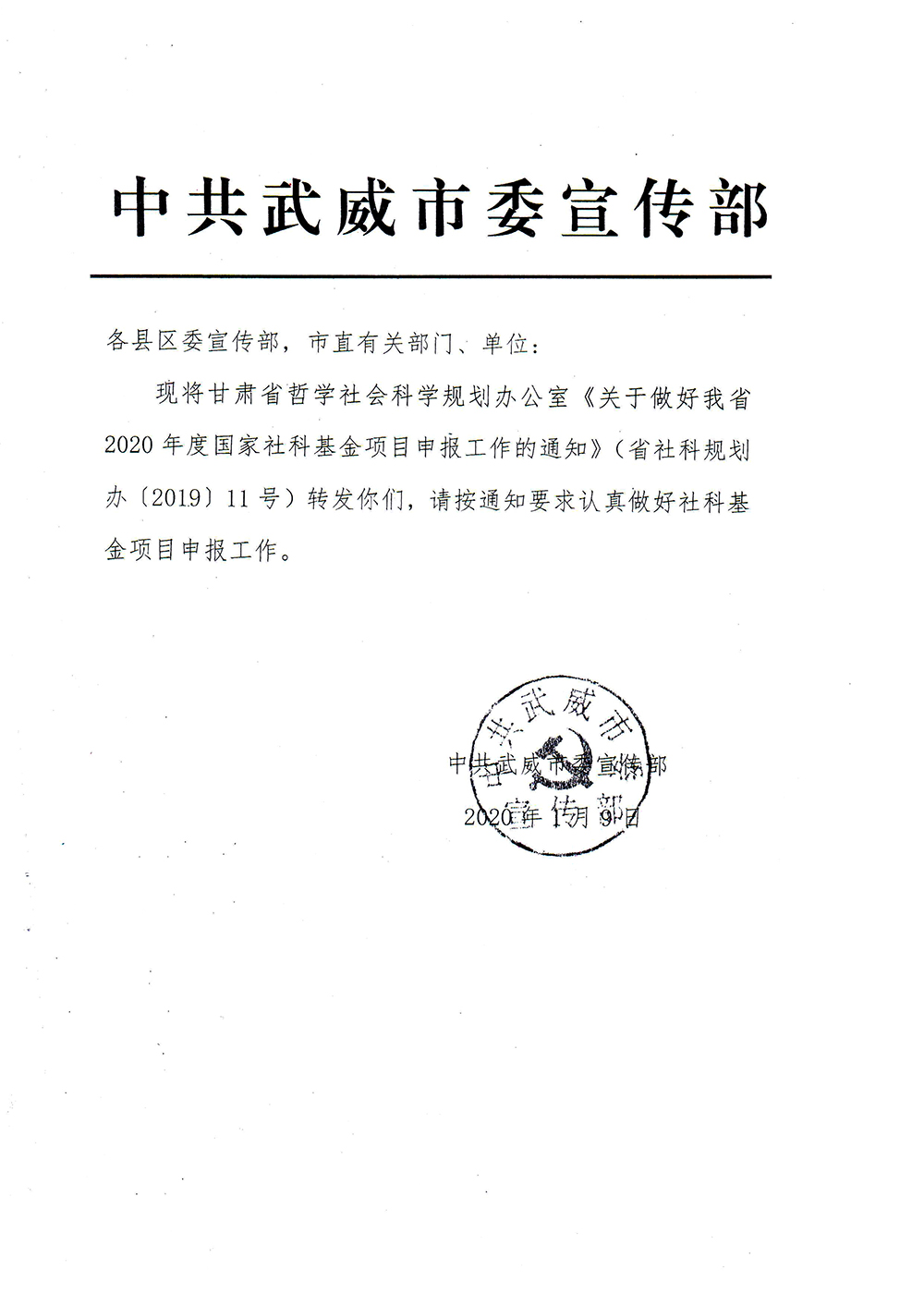 轉(zhuǎn)發(fā)中共武威市委宣傳部《關(guān)于做好甘肅省2020年度國家社科基金項(xiàng)目申報(bào)工作的通知》