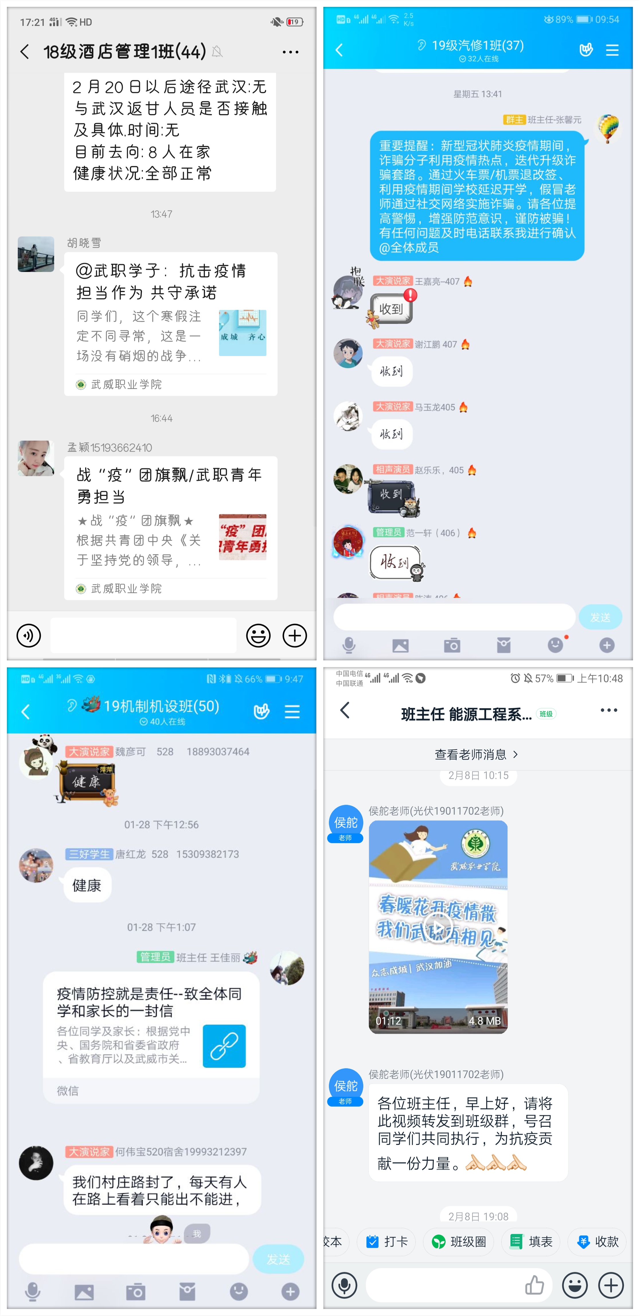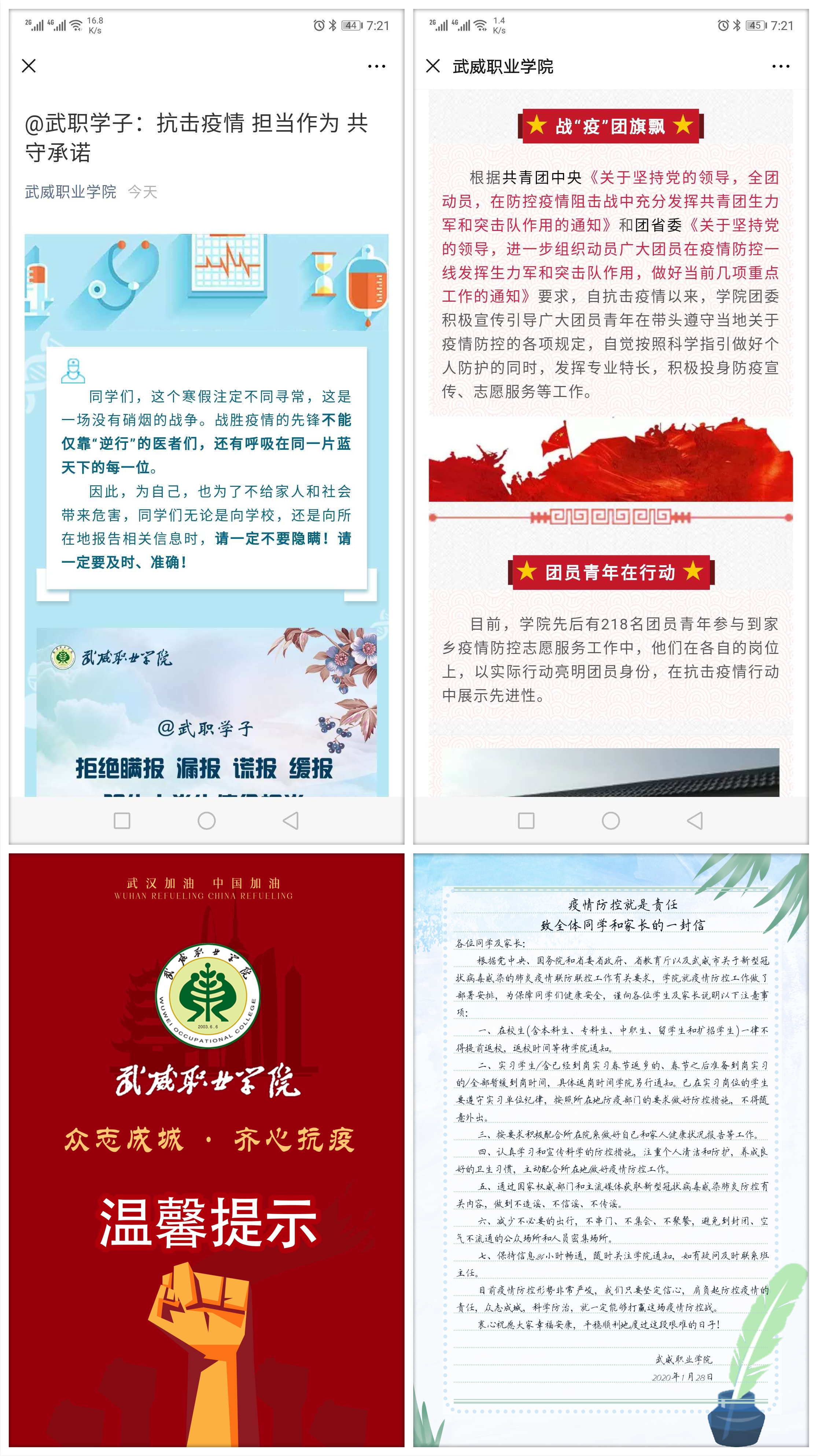 學(xué)生工作處及時(shí)發(fā)布了致學(xué)生和家長(zhǎng)的一封信《疫情防控就是責(zé)任》,團(tuán)委制作和推送了《春暖花開疫情散 我們武職再相見》溫馨提示短片和《@武職學(xué)子:抗擊疫情 擔(dān)當(dāng)作為 共守承諾》倡議,用生動(dòng)形象的表述要求和提醒同學(xué)們不得提前返校,做好個(gè)人防護(hù)措施,遵守當(dāng)?shù)匾咔榉揽馗黜?xiàng)要求,做到不信謠不傳謠,及時(shí)向?qū)W院報(bào)送個(gè)人防疫相關(guān)信息,不瞞報(bào)不慌報(bào)。各院系輔導(dǎo)員和班主任都會(huì)第一時(shí)間在學(xué)生群里轉(zhuǎn)發(fā),同時(shí)把學(xué)院網(wǎng)站和微信平臺(tái)上科學(xué)的防控知識(shí)和上級(jí)的有關(guān)精神及時(shí)傳達(dá)給學(xué)生,當(dāng)好疫情防控的宣傳員,做到戰(zhàn)疫有“力”。