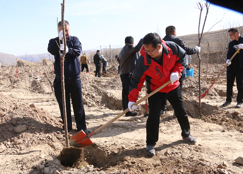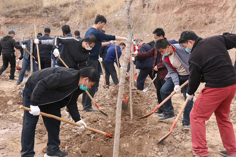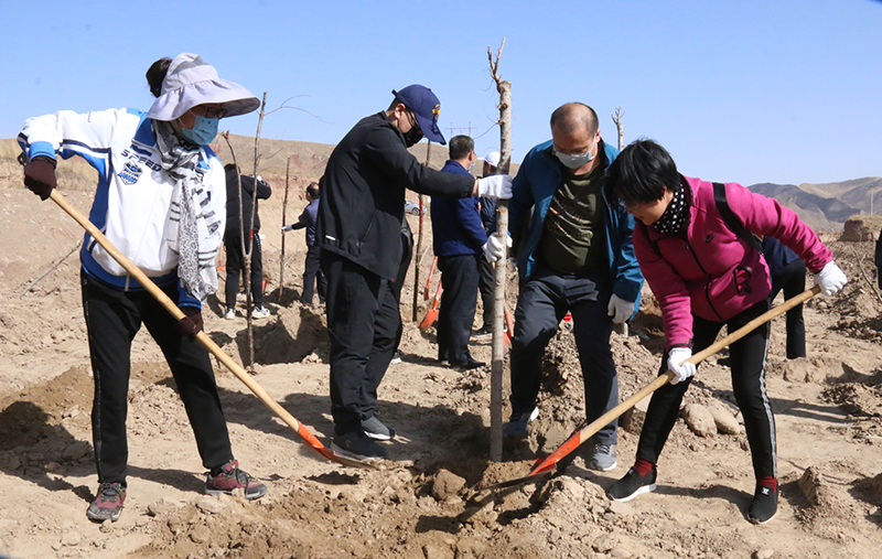 春風(fēng)吹拂處,新綠綻枝頭。為深入學(xué)習(xí)貫徹習(xí)近平總書記視察甘肅的重要講話和批示精神,認(rèn)真踐行綠水青山就是金山銀山的發(fā)展理念,實施綠色發(fā)展戰(zhàn)略,進(jìn)一步加強祁連山生態(tài)環(huán)境保護(hù)與治理,幫助幫扶鎮(zhèn)打贏脫貧攻堅戰(zhàn),實施鄉(xiāng)村振興戰(zhàn)略,4月9日,學(xué)院領(lǐng)導(dǎo)班子成員、幫扶干部、駐村干部及部分教職工70多人深入結(jié)對幫扶鎮(zhèn)——黑松驛鎮(zhèn)開展義務(wù)植樹活動,建設(shè)“生態(tài)示范林”。春光沐浴的祁連山腳下黑松驛鎮(zhèn),春意盎然,生機勃勃,正是植樹好時節(jié)。廣大教職工一下車就拿起鐵鍬到植樹現(xiàn)場,與黑松驛鎮(zhèn)政府部分干部一起投入植樹活動,按照“橫看直線側(cè)一線、三埋兩踩一提苗”的技術(shù)要求,三人一組,分工協(xié)作,有序配合,揮鍬培土、扶苖踩土、圍堰澆水,現(xiàn)場一派熱火朝天的勞動景象。當(dāng)天植樹育林約20余畝,一棵棵新栽的樹苗整齊排列,迎風(fēng)挺立。通過義務(wù)植樹,廣大教職工用實際行動傳播著生態(tài)文明、綠色發(fā)展理念,切實幫助幫扶鎮(zhèn)綠起來,美起來,富起來。