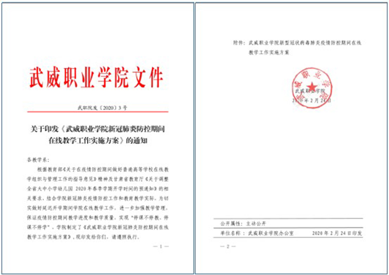 1月27日,學(xué)院新型冠狀病毒感染肺炎疫情聯(lián)防聯(lián)控工作領(lǐng)導(dǎo)小組召開會議,決定從1月28日開始停止學(xué)院一切線下教學(xué)活動,并組織擬訂學(xué)院在線教學(xué)工作方案。2月4日,學(xué)院初步制定完成《武威職業(yè)學(xué)院新型冠狀病毒肺炎疫情防控期間在線教學(xué)工作實(shí)施方案》并面向全院征求意見,同時(shí)要求各教學(xué)系積極謀劃、科學(xué)論證,制定各系在線教學(xué)工作實(shí)施方案。2月8日-14日,教務(wù)處陸續(xù)向各教學(xué)系推送教育部發(fā)布的各大教學(xué)平臺支持高校開展在線教學(xué)服務(wù)方案,并篩選中國大學(xué)MOOC、人衛(wèi)慕課、超星慕課、學(xué)銀在線等教學(xué)平臺推出的課程資源供各系參考使用,同時(shí)指導(dǎo)各系做好課程在線教學(xué)計(jì)劃編制工作。