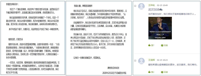 《中華優(yōu)秀傳統(tǒng)文化》課程團(tuán)隊(duì)的馮文娟老師在開學(xué)第一天借助在線教學(xué)平臺向?qū)W生推送了《致2019級學(xué)生的一封信》,激勵學(xué)生要敬畏自然、珍愛生命,致敬英雄、感恩榜樣,寬闊心胸、厚植家國情懷。信中這樣寫道:“在疫情防控中,我們無時(shí)無刻不在感受國家的力量,正因?yàn)橛羞@樣強(qiáng)大的力量,讓我們在困難面前堅(jiān)守責(zé)任,無私奉獻(xiàn),眾志成城,充滿信心地迎接戰(zhàn)勝疫情的勝利曙光?!薄?家是最小國,國是千萬家。在這個(gè)沒有硝煙的戰(zhàn)場,建造武漢火神山、雷神山醫(yī)院的中國速度,證明了我們擁有戰(zhàn)勝疫情的強(qiáng)大力量;捐資捐物,證明了我們有打贏疫情阻擊戰(zhàn)的中國精神;全國人民上下一心,自我隔離,更體現(xiàn)了我們共同戰(zhàn)勝困難的堅(jiān)定決心。春天已到,歷經(jīng)苦寒依舊傲然的梅花,定將帶著勝利的消息和沁人的花香一同到來?!蓖瑫r(shí),為學(xué)生推送由央視頻和有道精品課共同錄制的《面對疫情教你如何有效防范》疫情防控專題視頻,與學(xué)生一起為打贏新冠肺炎疫情防控阻擊戰(zhàn)貢獻(xiàn)力量。