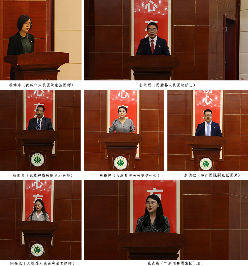 宣講報告團(tuán)成員由6位援鄂優(yōu)秀隊員代表和市新聞傳媒集團(tuán)的1位記者組成。宣講會上,武威市人民醫(yī)院主治醫(yī)師徐海玲、民勤縣人民醫(yī)院護(hù)士孫屹程、武威腫瘤醫(yī)院主治醫(yī)師楊國泉、古浪縣中醫(yī)醫(yī)院護(hù)士長來積婷、涼州醫(yī)院副主任醫(yī)師趙德仁、天??h人民醫(yī)院主管護(hù)師閆登蘭,市新聞傳媒集團(tuán)記者張尚梅,用自己的親身經(jīng)歷和樸實生動的語言,從主動請戰(zhàn)、逆行出征、克服困難、參與救治、關(guān)愛患者、勝利歸來等多個方面,滿懷深情地講述了他們在支援湖北期間的難忘瞬間與暖心經(jīng)歷。他們用實際行動譜寫了一曲感天動地的英雄贊歌,生動詮釋了新時代武威精神,是武威人民的優(yōu)秀兒女,是當(dāng)之無愧的“白衣戰(zhàn)士”、“最美逆行者”和“新時代最可愛的人”。會場不時響起如雷的掌聲。武威援鄂醫(yī)療隊全體成員以強(qiáng)烈的使命感和責(zé)任感,堅持奮戰(zhàn)在抗擊疫情的最前沿,展現(xiàn)了崇高的使命擔(dān)當(dāng),樹立了新時代的典型榜樣。