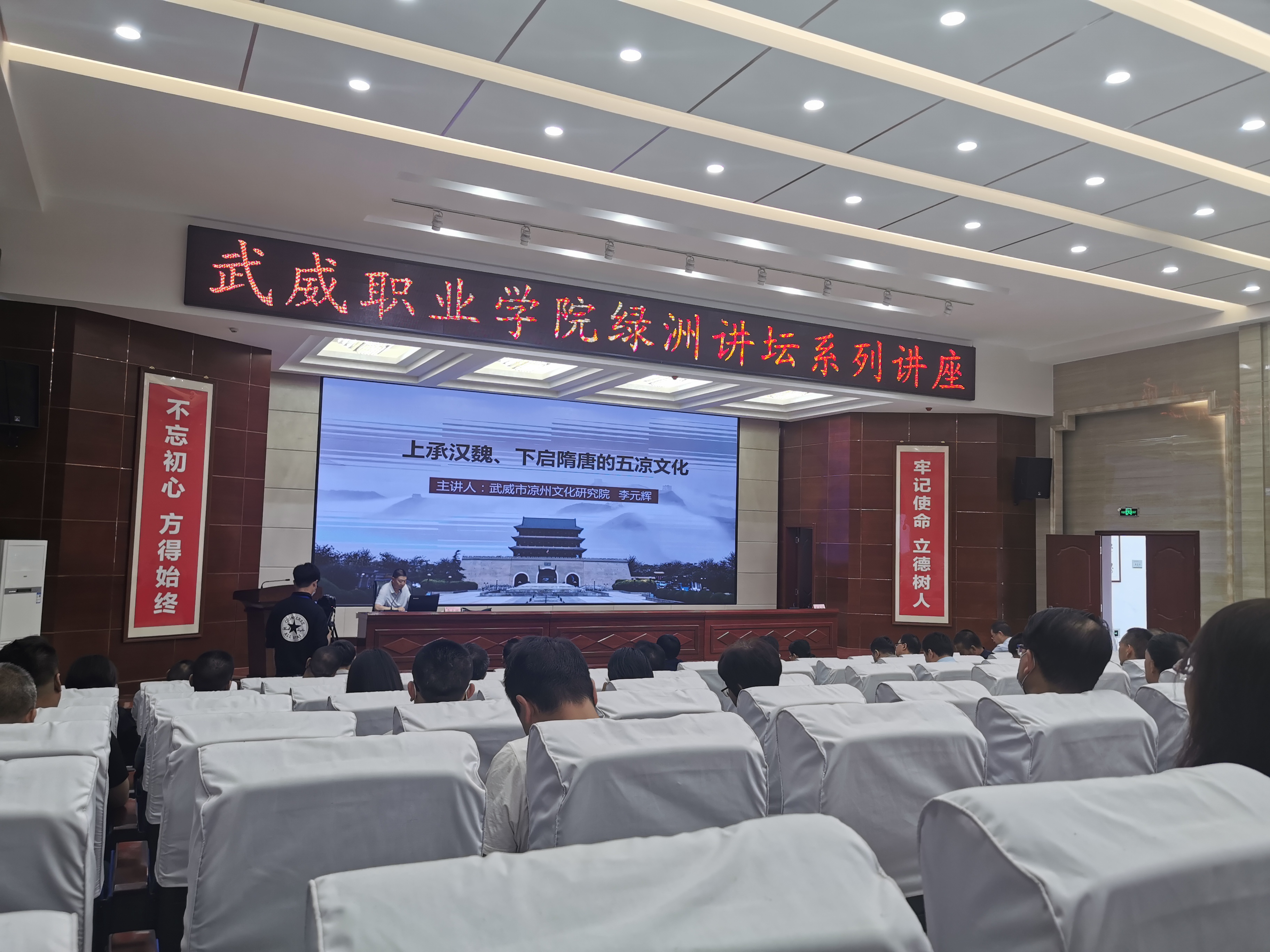 李元輝研究員圍繞“走進(jìn)武威,觸摸五涼;五涼興亡,百年滄桑;承前啟后,繼絕扶衰;文脈綿延,繼往開來”等方面講述了涼州文化的獨(dú)特稟賦、鮮明特征和豐富內(nèi)涵,以及對中國歷史文化的深遠(yuǎn)影響、對中原傳統(tǒng)文化的繼承和創(chuàng)新,為學(xué)院師生分享了一場期待已久的文化盛宴和精神大餐。