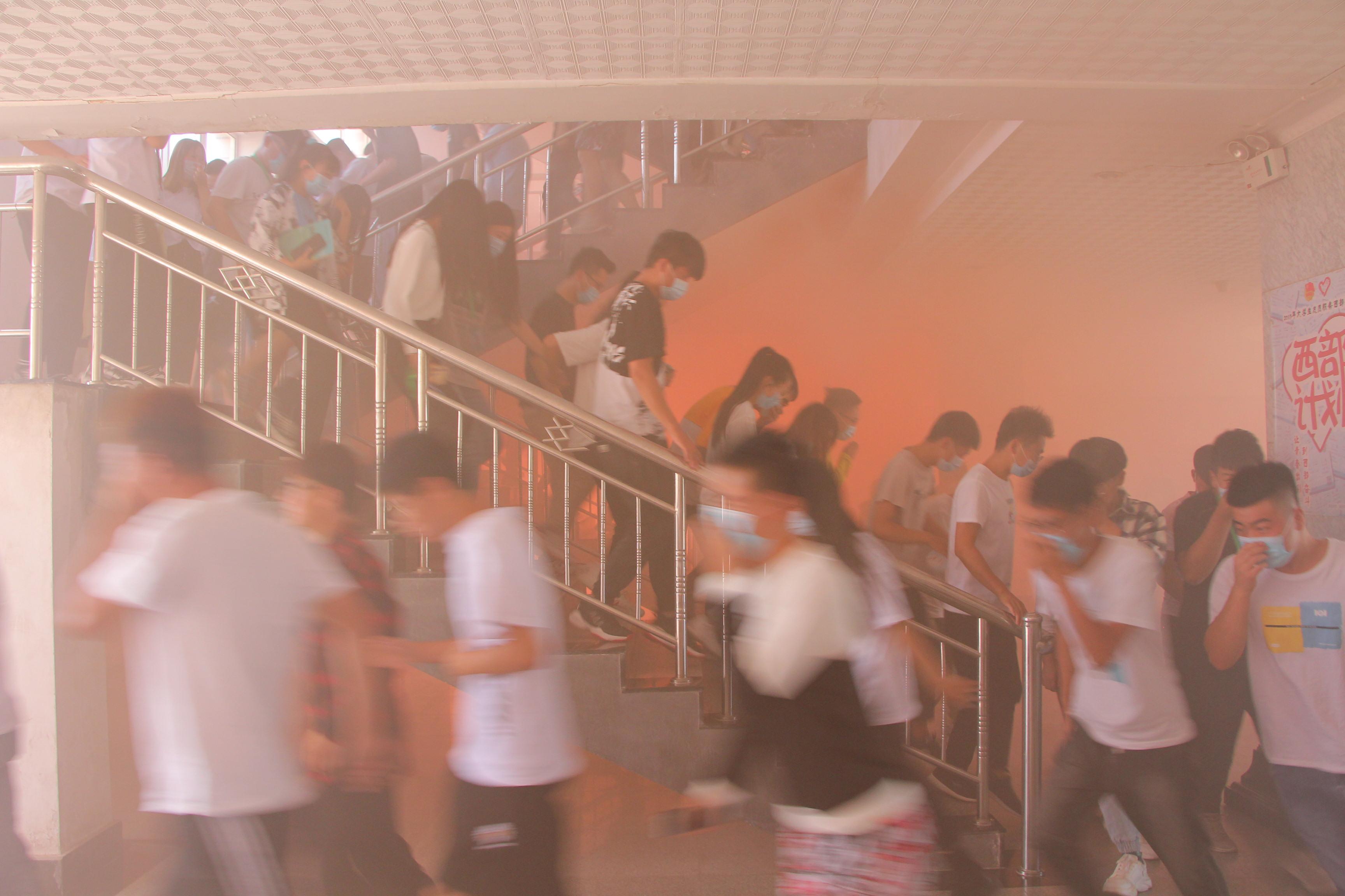 下午4點46分,疏散演練正式開始。隨著消防警報響起,各教學(xué)班上課教師立即停止上課組織學(xué)生疏散,學(xué)生用濕毛巾捂住口鼻,按照逃生路線有序疏散。在3分鐘內(nèi),6000多名參演師生全部撤離到了安全地帶,演練取得圓滿成功。