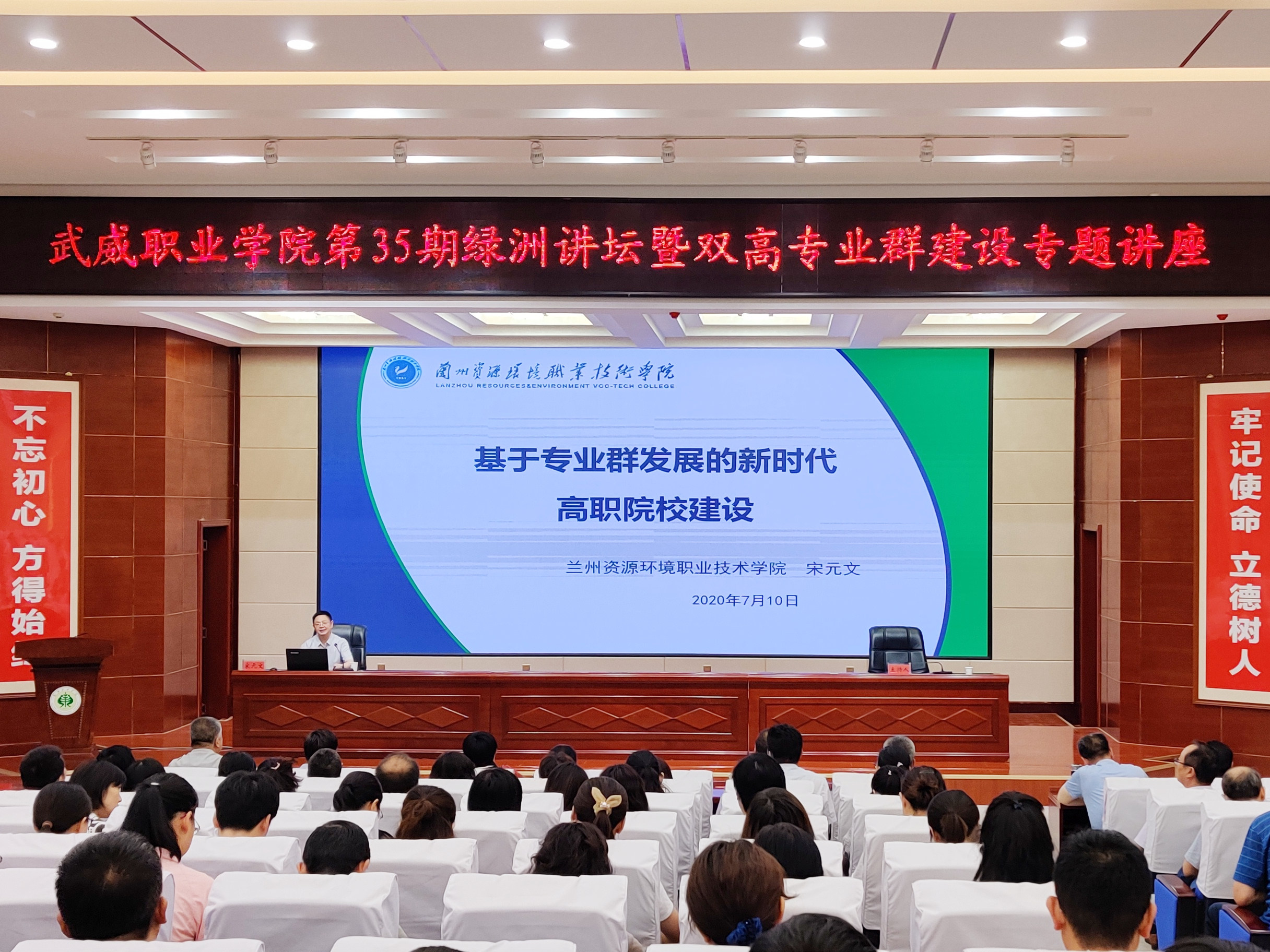7月11日上午,學(xué)院在大學(xué)生活動中心菁英廳舉辦第35期綠洲講壇暨雙高專業(yè)群建設(shè)專題講座。學(xué)院黨委書記、院長趙明主持報告會,黨委副書記翟存祥,黨委委員、副院長田迎春、何毅、張開禮、王守云,武威職教集團成員單位代表,學(xué)院各部門和教學(xué)院系負(fù)責(zé)人、專業(yè)負(fù)責(zé)人和教師代表共計200余人參加了報告會。圖為蘭州資源環(huán)境職業(yè)技術(shù)學(xué)院黨委委員、副院長宋元文教授作“基于專業(yè)群發(fā)展的新時代高職院校建設(shè)”專題報告。