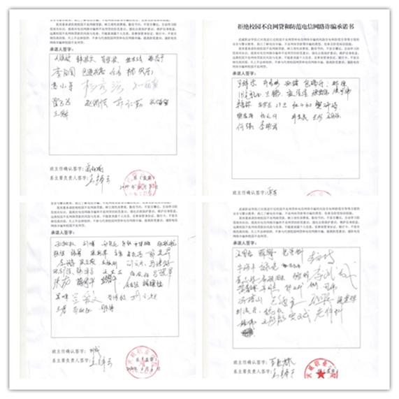 ??對學(xué)生進行校園不良網(wǎng)貸和電信網(wǎng)絡(luò)詐騙的風(fēng)險告知和防范引導(dǎo)等方面的安全與警示教育,讓學(xué)生了解電信詐騙、不良網(wǎng)絡(luò)貸款等詐騙的類型、危害及防范知識技能。自愿簽訂拒絕不良網(wǎng)貸和防范電信網(wǎng)絡(luò)詐騙承諾書。