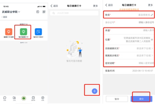 2.每日健康打卡:點(diǎn)擊每日健康打開(kāi)——點(diǎn)擊右下角?號(hào)——點(diǎn)擊姓名框選擇姓名——填寫內(nèi)容——提交。