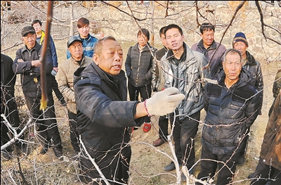⑦ 李保國(前左)在河北省內(nèi)丘縣崗底村向村民講解果樹修剪知識(shí)(1月27日攝)。