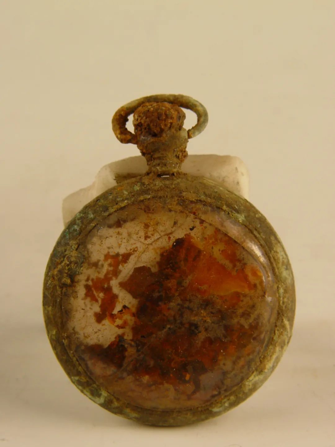 這只懷表于1971年從撫順平頂山慘案遺址出土,表蒙有明顯的裂痕,表盤內(nèi)已經(jīng)沒有指針。雖然銹蝕嚴(yán)重,但仍能看到被火燒過的痕跡。這只沒有指針的懷表,凝固了時(shí)間,也凝固了侵華日軍的滔天罪行。