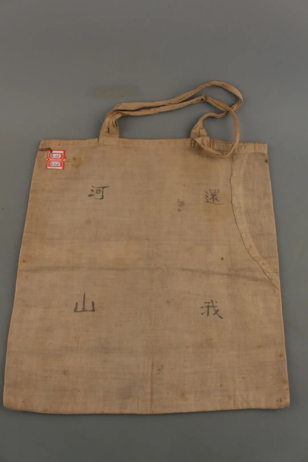 “還我河山”,車向忱夫婦用過的手提兜上,四個(gè)字依然清晰?!熬乓话恕笔伦兒?,東北淪陷,教育家車向忱多次往返關(guān)內(nèi)外,積極組織抗日救亡運(yùn)動(dòng),還創(chuàng)辦了許多平民學(xué)校。這個(gè)手提兜原為白色,歷經(jīng)歲月和戰(zhàn)火,現(xiàn)已陳舊發(fā)黃。布兜正面繡有黑色“收復(fù)東北失地,1938”字樣,背面寫有“還我河山”字樣。