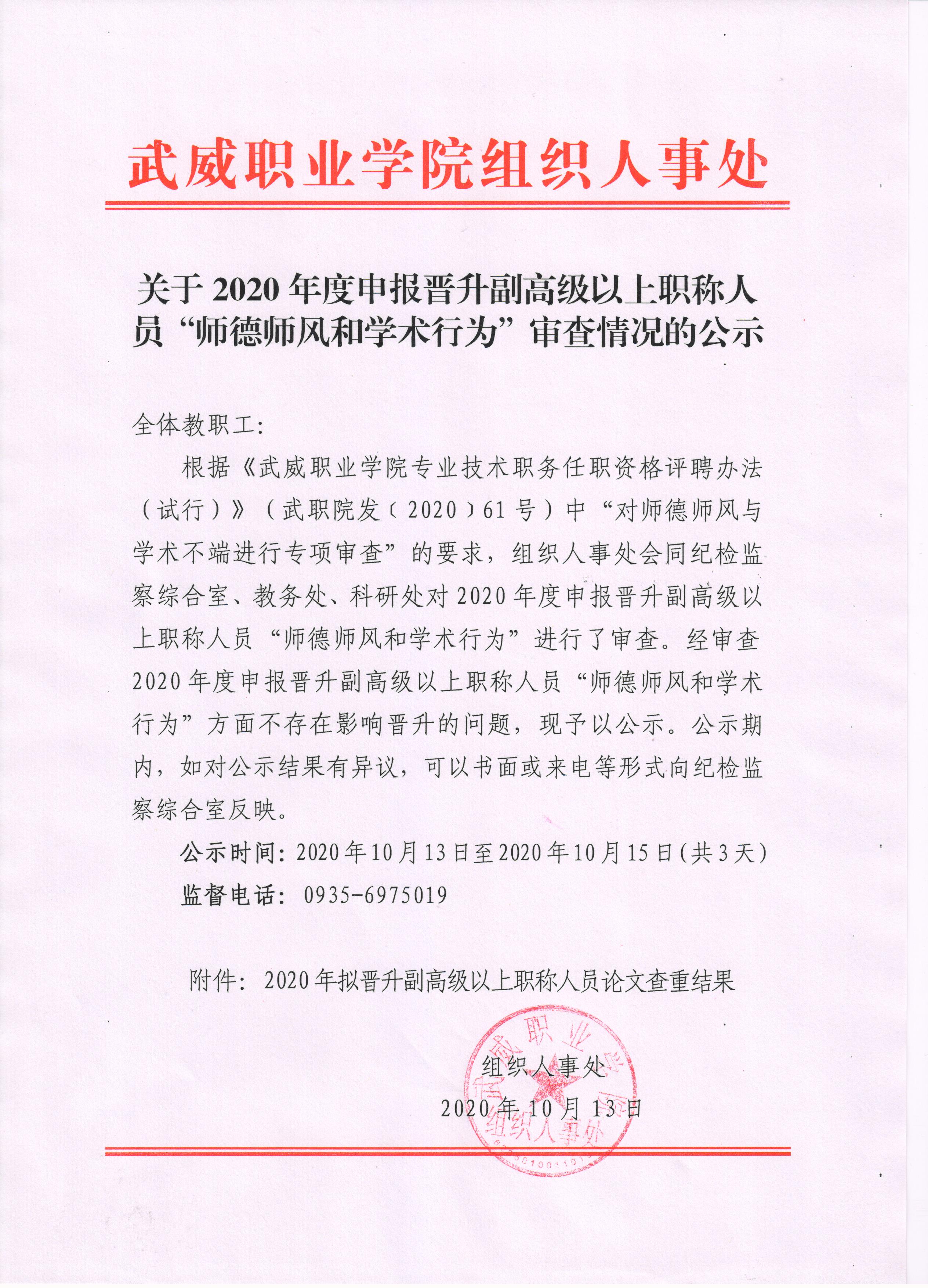 關于2020年度申報晉升副高級以上職稱人員“師德師風和學術(shù)行為”審查情況的公示