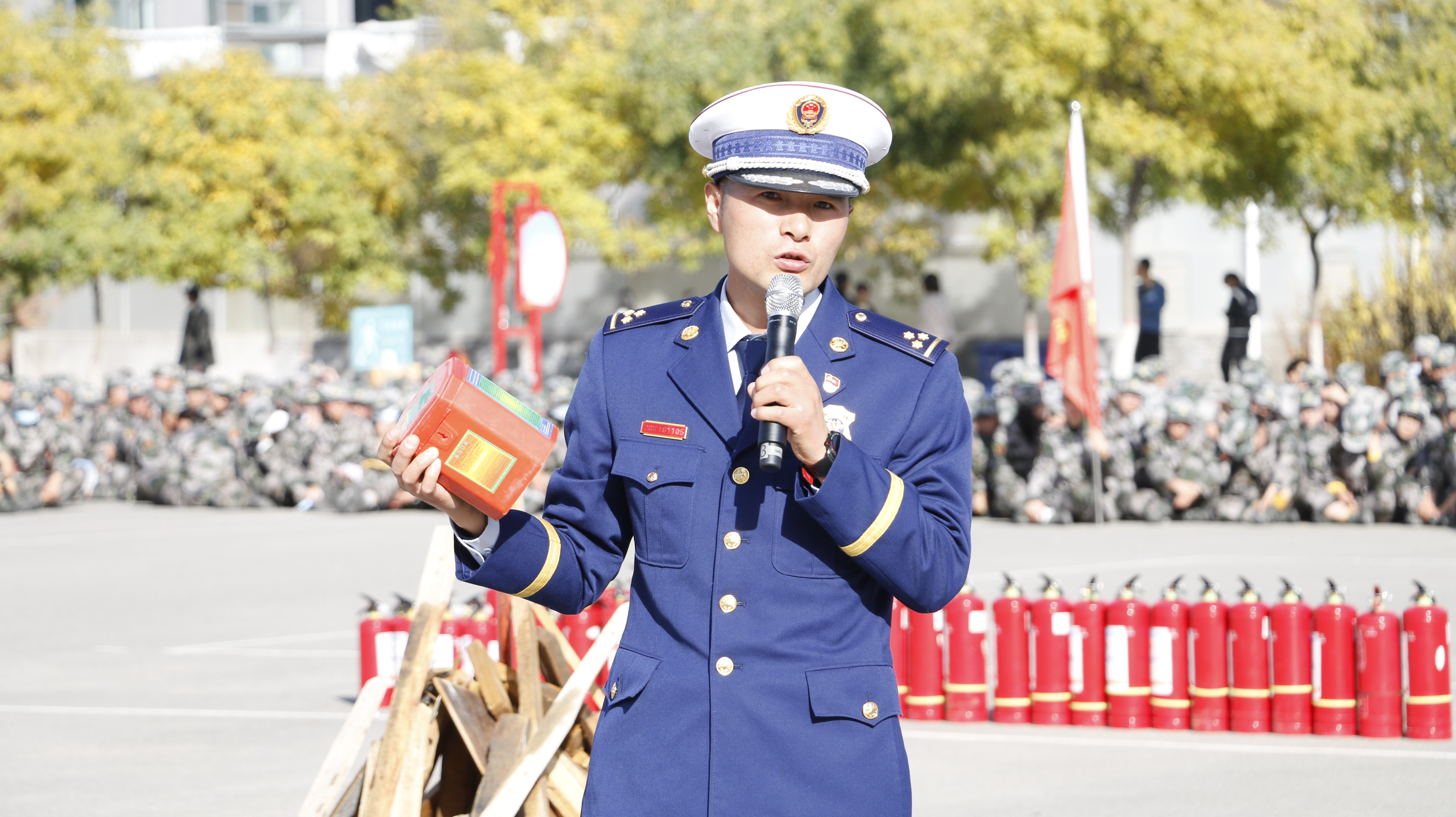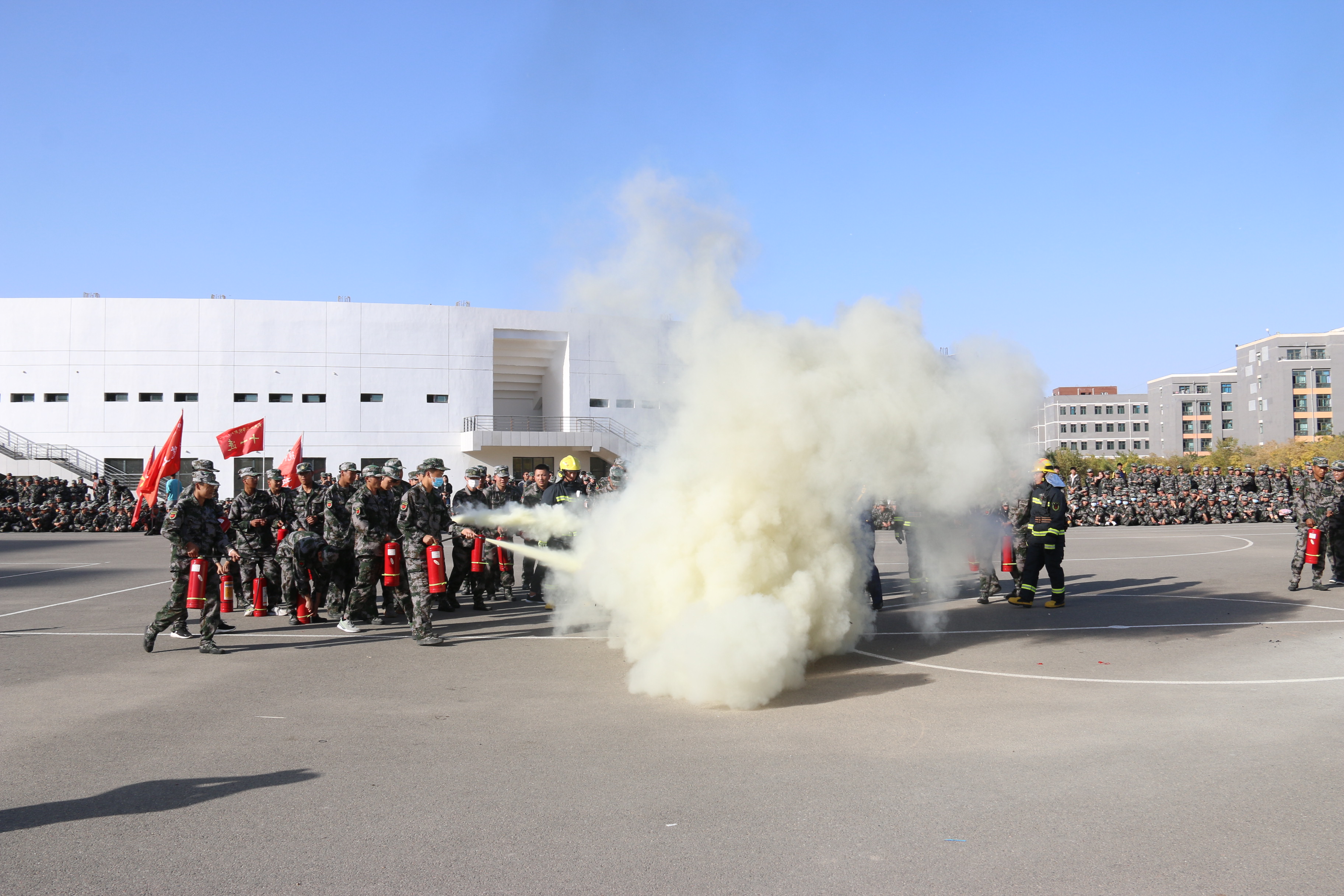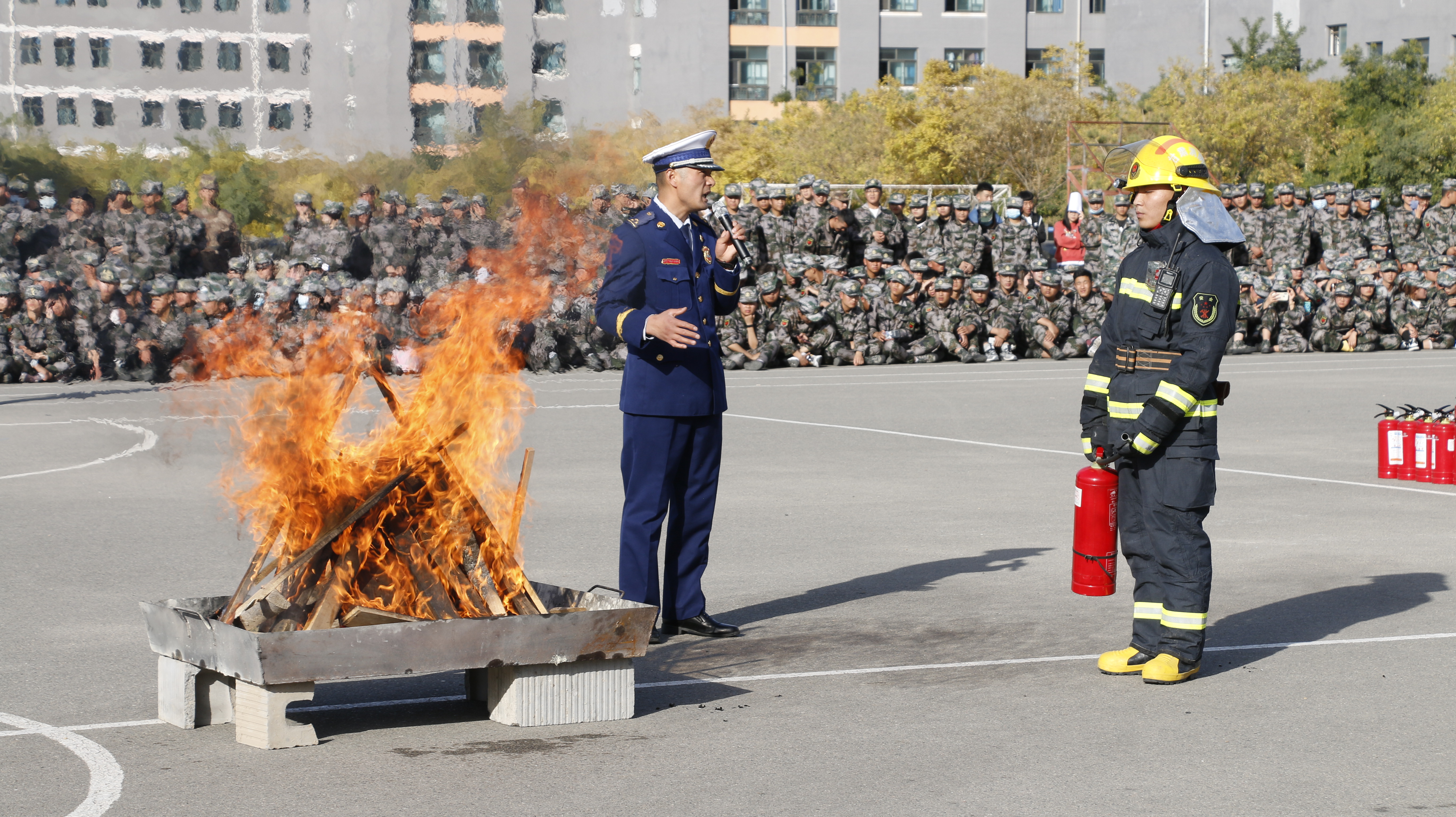 隨后,2020級(jí)全體新生整隊(duì)到操場(chǎng)參加了滅火演練。在消防救援中隊(duì)指戰(zhàn)員的講解和示范下,同學(xué)們學(xué)習(xí)了應(yīng)急逃生、火災(zāi)報(bào)警和滅火器使用等消防安全常識(shí),學(xué)生代表體驗(yàn)了處置液化氣瓶滅火、油鍋滅火、干粉滅火器滅火等操作,在實(shí)戰(zhàn)中提高了消防應(yīng)急能力。