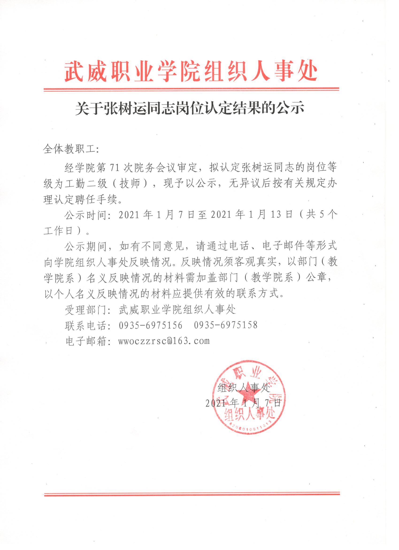 關(guān)于張樹運同志崗位認定結(jié)果的公示