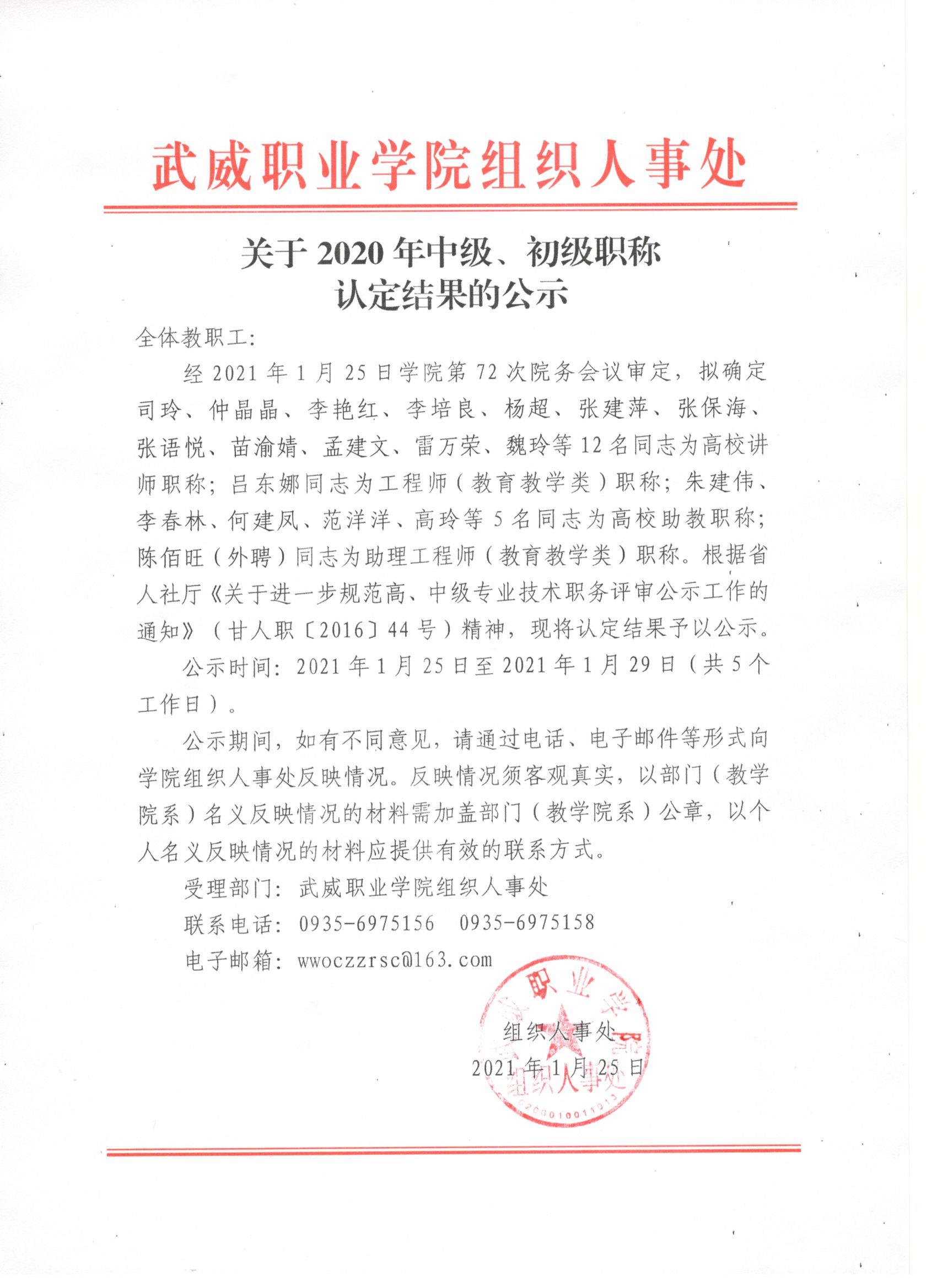 關(guān)于2020年中級、初級職稱認(rèn)定結(jié)果的公示
