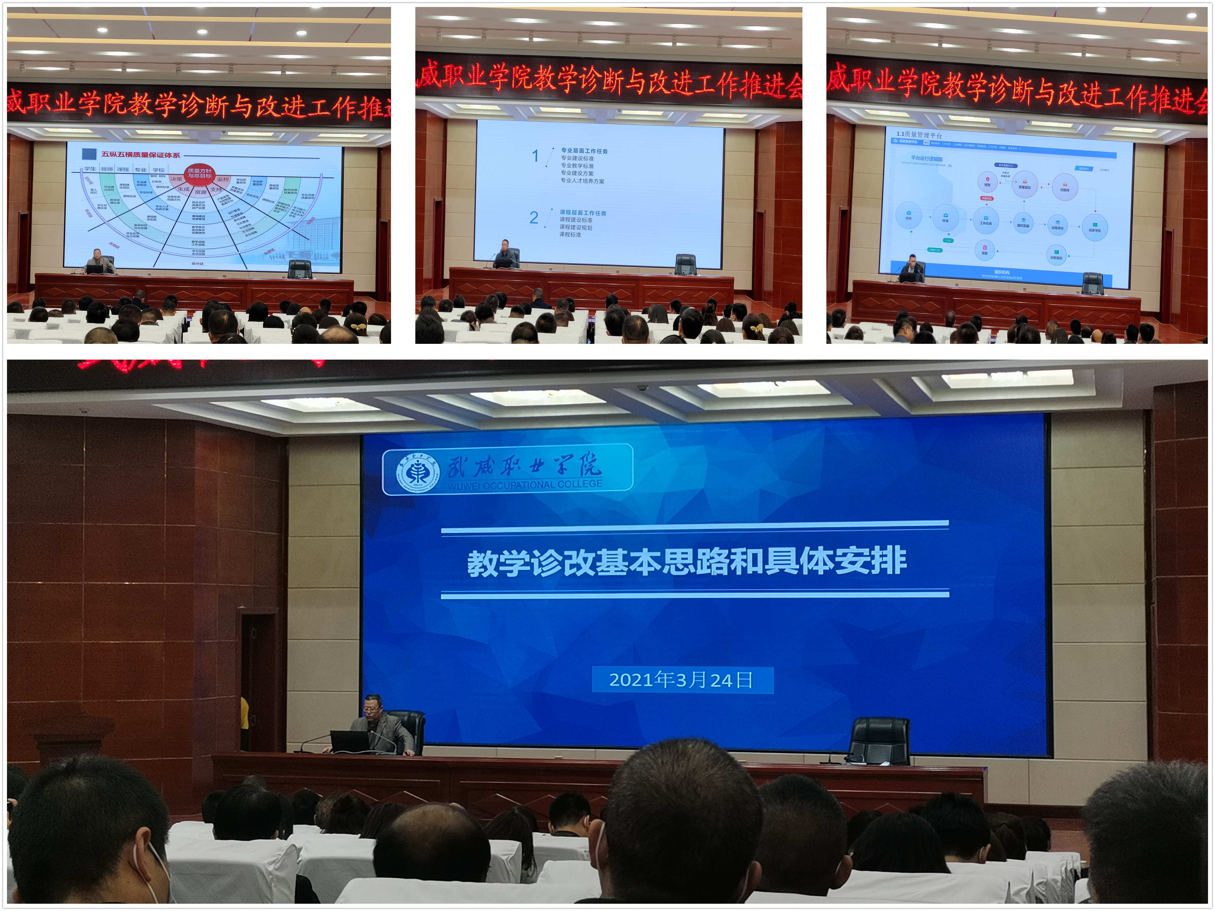 會上,質(zhì)量管理辦公室主任魏潤明以《教學(xué)診改基本思路和具體安排》為題匯報了構(gòu)建“五縱五橫”內(nèi)部質(zhì)量保證體系、梳理學(xué)院事業(yè)發(fā)展規(guī)劃打造“目標(biāo)鏈”、建立標(biāo)準(zhǔn)體系做實(shí)“目標(biāo)鏈”及具體安排;教務(wù)處副處長張世亮以《學(xué)院專業(yè)與課程層面教學(xué)診斷工作實(shí)施思路》為題重點(diǎn)匯報了學(xué)院專業(yè)、課程層面當(dāng)前面臨的診改工作和開展情況及下一步工作安排;診改智能化信息管理平臺建設(shè)服務(wù)負(fù)責(zé)人就診改平臺基本架構(gòu)、模塊功能、常見問題等做了介紹。
