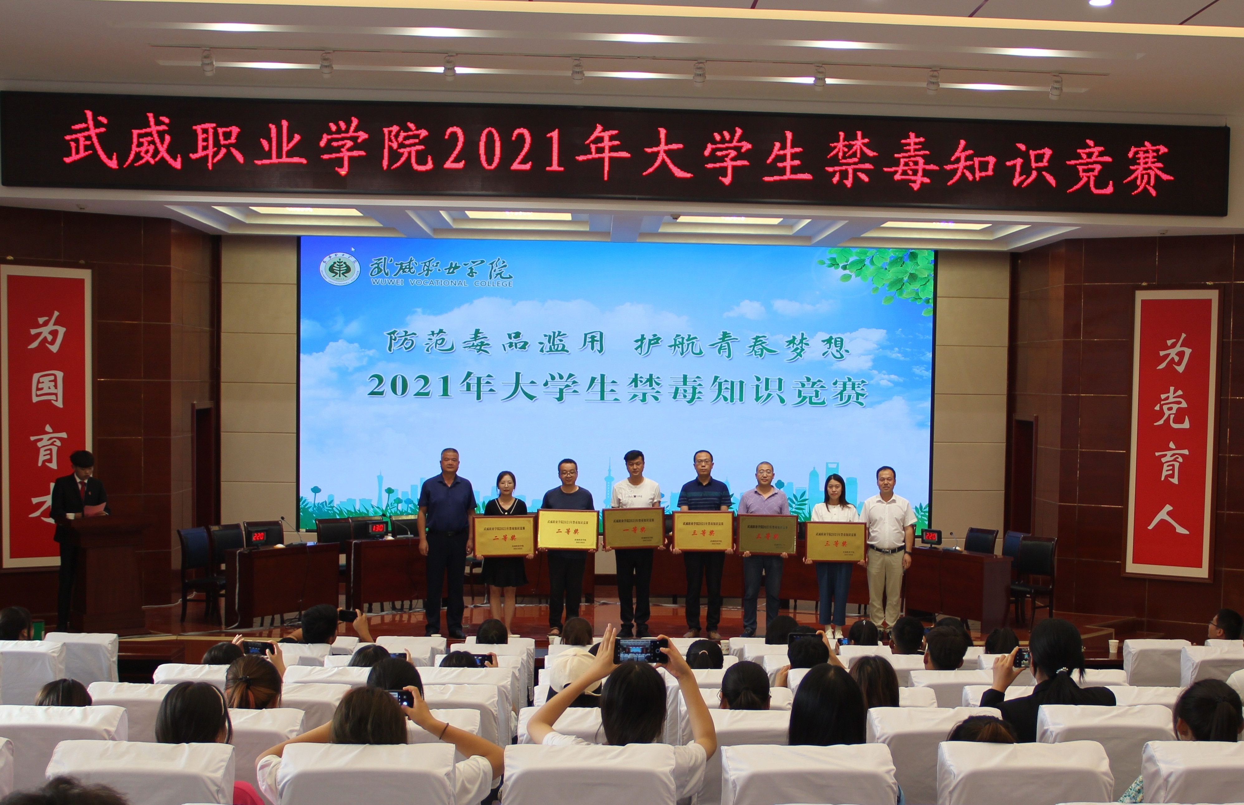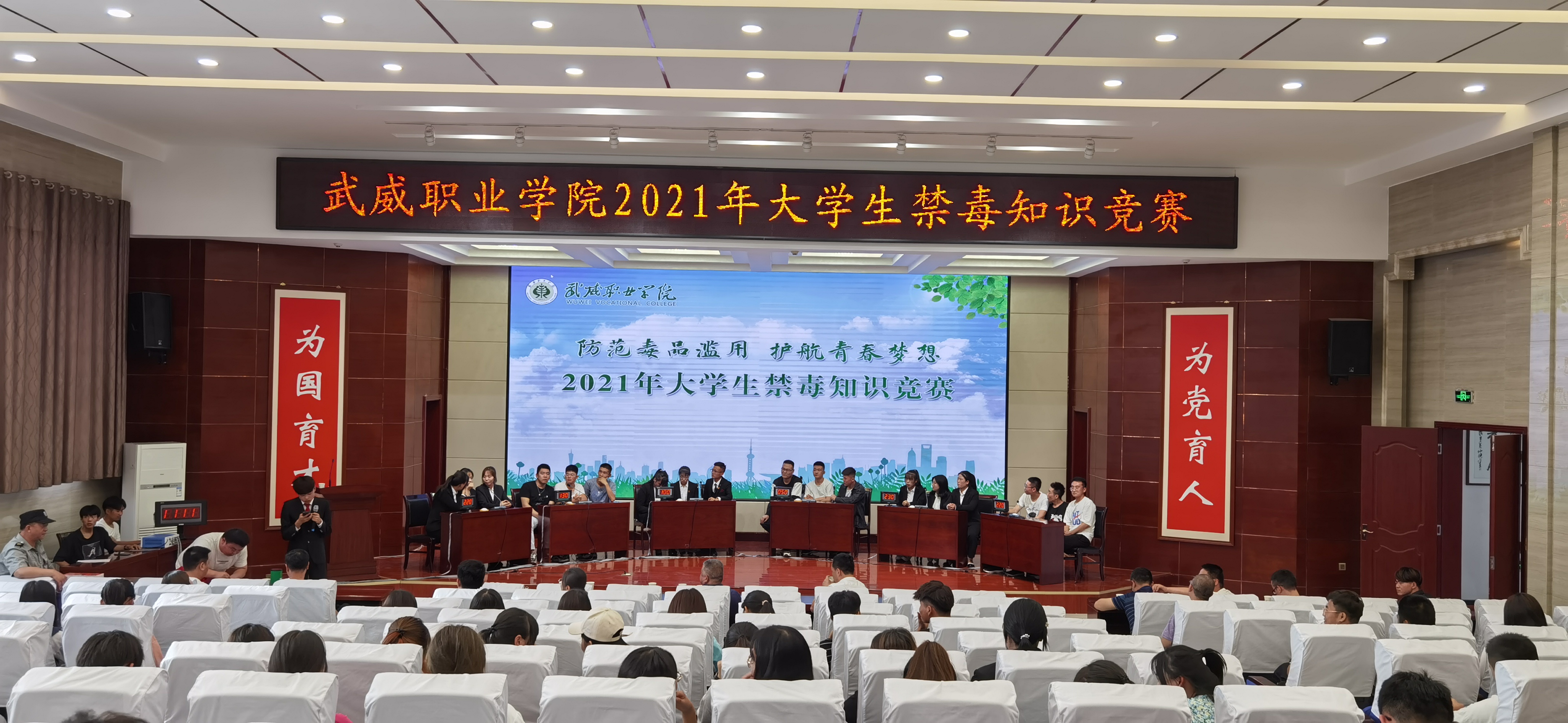 為加強(qiáng)在校大學(xué)生禁毒知識普及教育,深入推進(jìn)青少年毒品預(yù)防教育“6.27”工程,7月5日下午,學(xué)院在菁英廳舉辦以“防范毒品濫用,護(hù)航青春夢想”為主題的2021年大學(xué)生禁毒知識競賽決賽。學(xué)院黨委委員、副院長王守云出席活動。各教學(xué)院系200多名師生觀看了比賽。