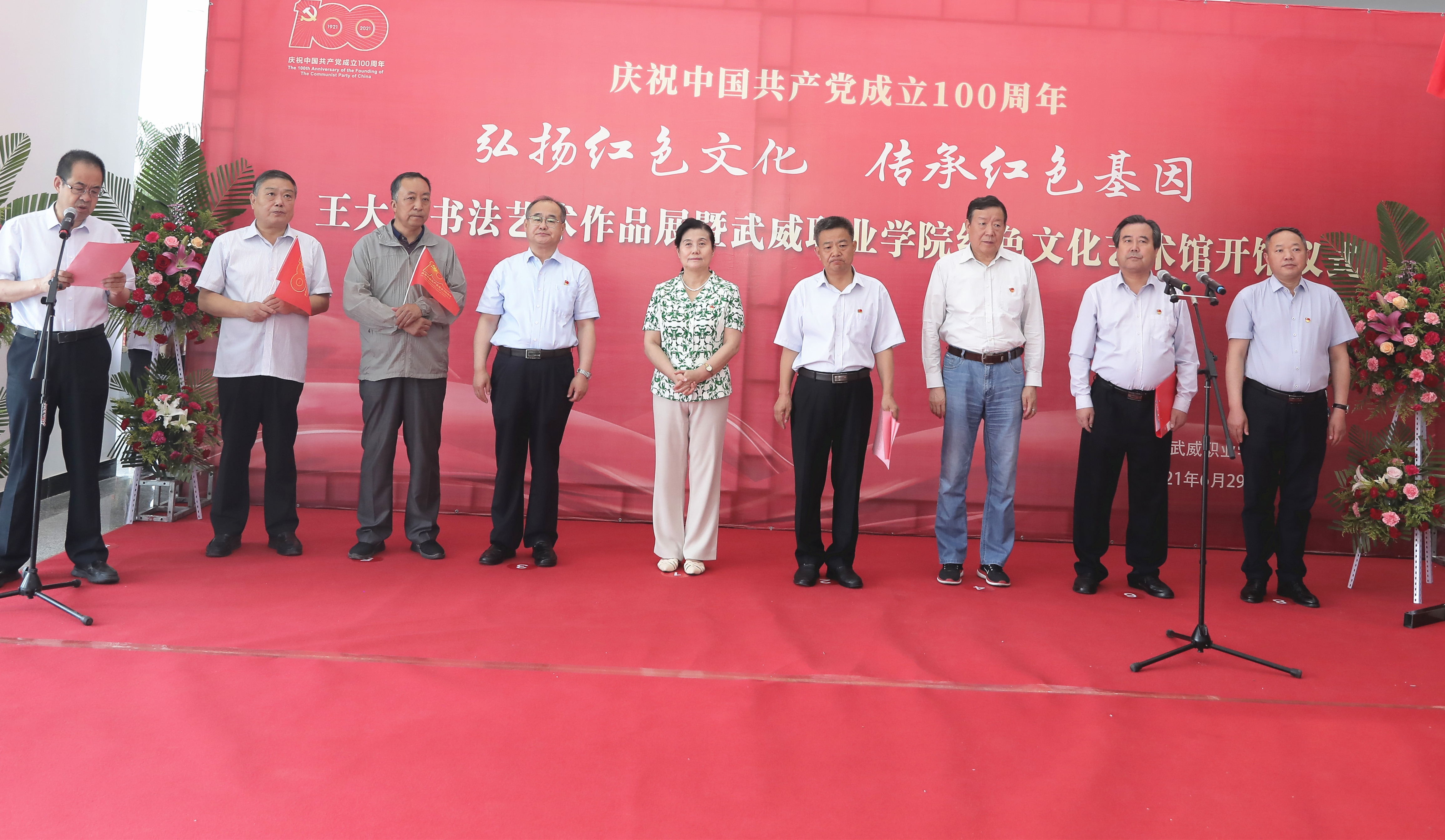 丹青吐彩書黨恩,紅心向黨寄情懷。6月29日上午,慶祝建黨100周年“弘揚(yáng)紅色文化、傳承紅色基因”王大臣書法作品展開展暨武威職業(yè)學(xué)院紅色文化藝術(shù)館開館儀式在能源科技樓一樓大廳隆重舉行。武威市黨史學(xué)習(xí)教育第六巡回指導(dǎo)組組長(zhǎng)、市政協(xié)教科衛(wèi)體委員會(huì)副主任、一級(jí)調(diào)研員邢立華;中國科學(xué)院先進(jìn)核能創(chuàng)新研究院高級(jí)教育顧問、中科低碳新能源技術(shù)學(xué)院院長(zhǎng)楊存忠教授,中核集團(tuán)(西北)市場(chǎng)開發(fā)部主任梁志強(qiáng),中核集團(tuán)(西北)市場(chǎng)開發(fā)部副主任田玉成,中國科學(xué)院先進(jìn)核能創(chuàng)新研究院副研究員、中科低碳新能源技術(shù)學(xué)院院長(zhǎng)助理米麗娟博士,著名文化學(xué)者、書法家顧振祖,市審計(jì)局紀(jì)委書記李鏡,學(xué)院客座教授、涼州區(qū)政協(xié)原副主席王大臣出席儀式。中核集團(tuán)(西北)市場(chǎng)開發(fā)部辦公室領(lǐng)導(dǎo)專家、學(xué)院在家領(lǐng)導(dǎo)班子成員、中層干部、師生黨員代表、思政課教師代表、學(xué)生團(tuán)員代表、學(xué)院攻鼓子藝術(shù)團(tuán)參加儀式。學(xué)院黨委副書記翟存祥主持儀式。