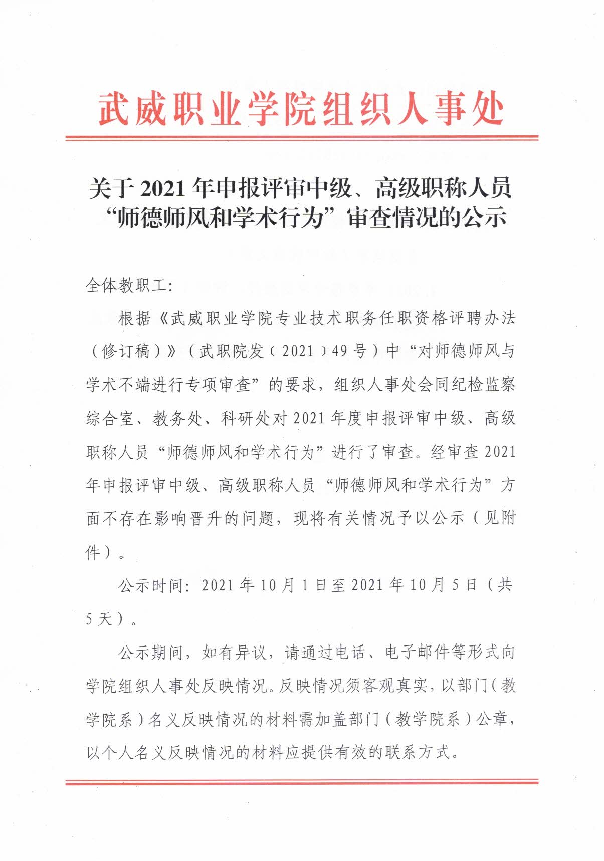 關(guān)于2021年申報(bào)評審中級、高級職稱人員“師德師風(fēng)和學(xué)術(shù)行為”審查情況的公示