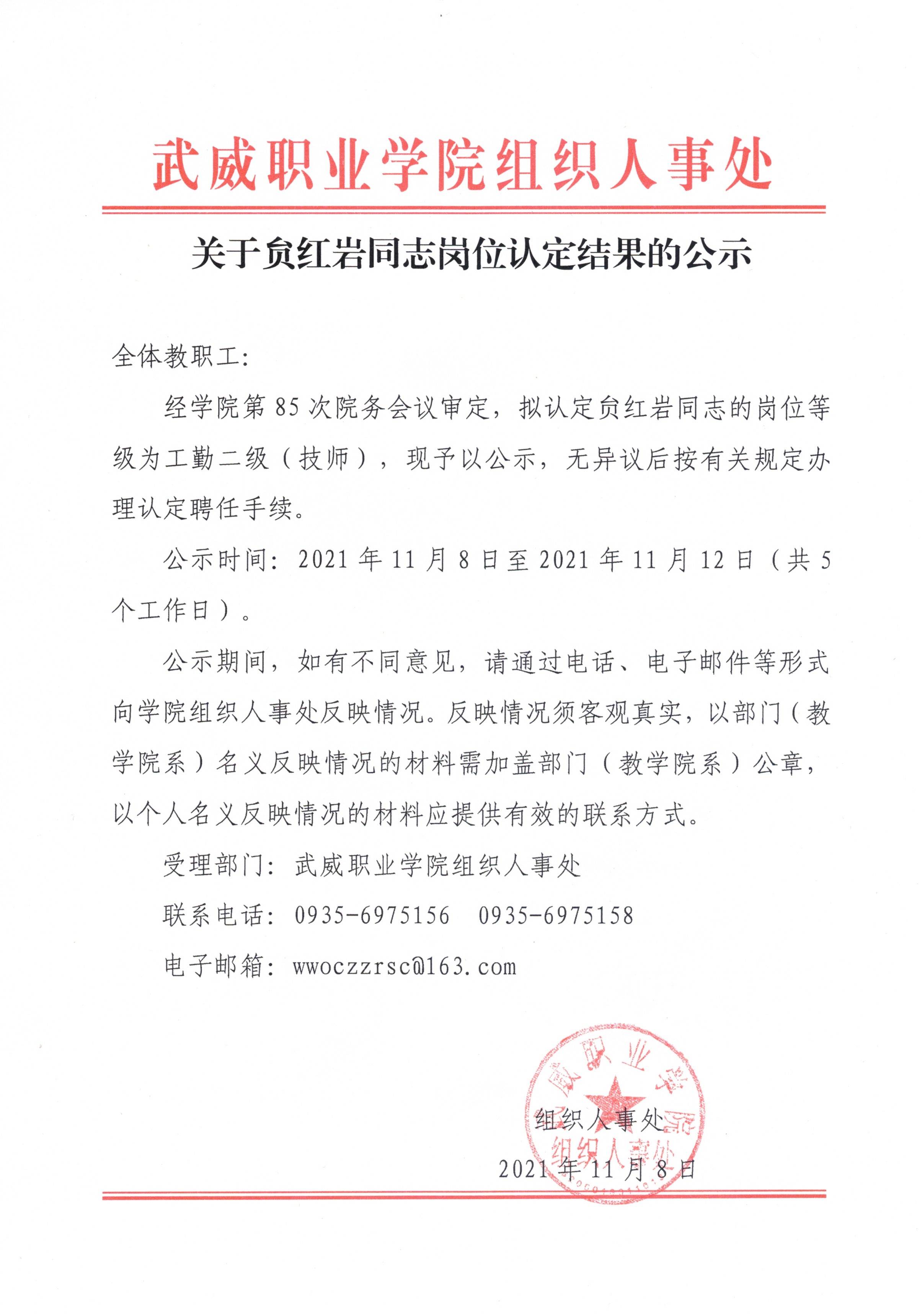 關(guān)于贠紅巖同志崗位認定結(jié)果的公示